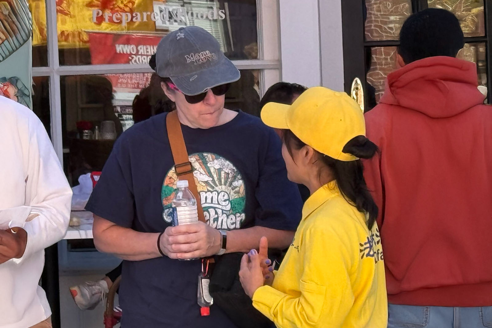 او گفت که با مرور زندگیاش احساس خوشبختی میکند که در دام پول یا شهرت گرفتار نشده است. او خود را بهموقع آزاد کرد تا به سراسر جهان سفر کند و از صومعهها و معابد تائوئیستی بازدید کرد، ازجمله بیش از ده سفر به تایلند. او گفت: «بهنظر میرسد در جستجوی چیزی هستم. احساس خوشاقبالی میکنم که امروز با فالون دافا آشنا شدم. امیدوارم درک عمیقتری از آن بهدست آورم.» وی پیش از ترک غرفه، با تمرینکنندگان قرار گذاشت تا در آخر هفته، تمرینات را در «بوستون کامن» بیاموزد.