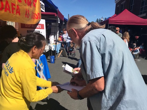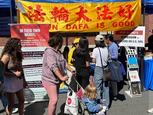 یک خانواده چینی بارها به غرفه فالون دافا آمدند. آنها تعدادی بروشور اطلاعرسانی درباره این تمرین و چند آویز دستساز بهشکل گل نیلوفرآبی برداشتند که رویشان عبارت «حقیقت، نیکخواهی، بردباری» نوشته شده بود.