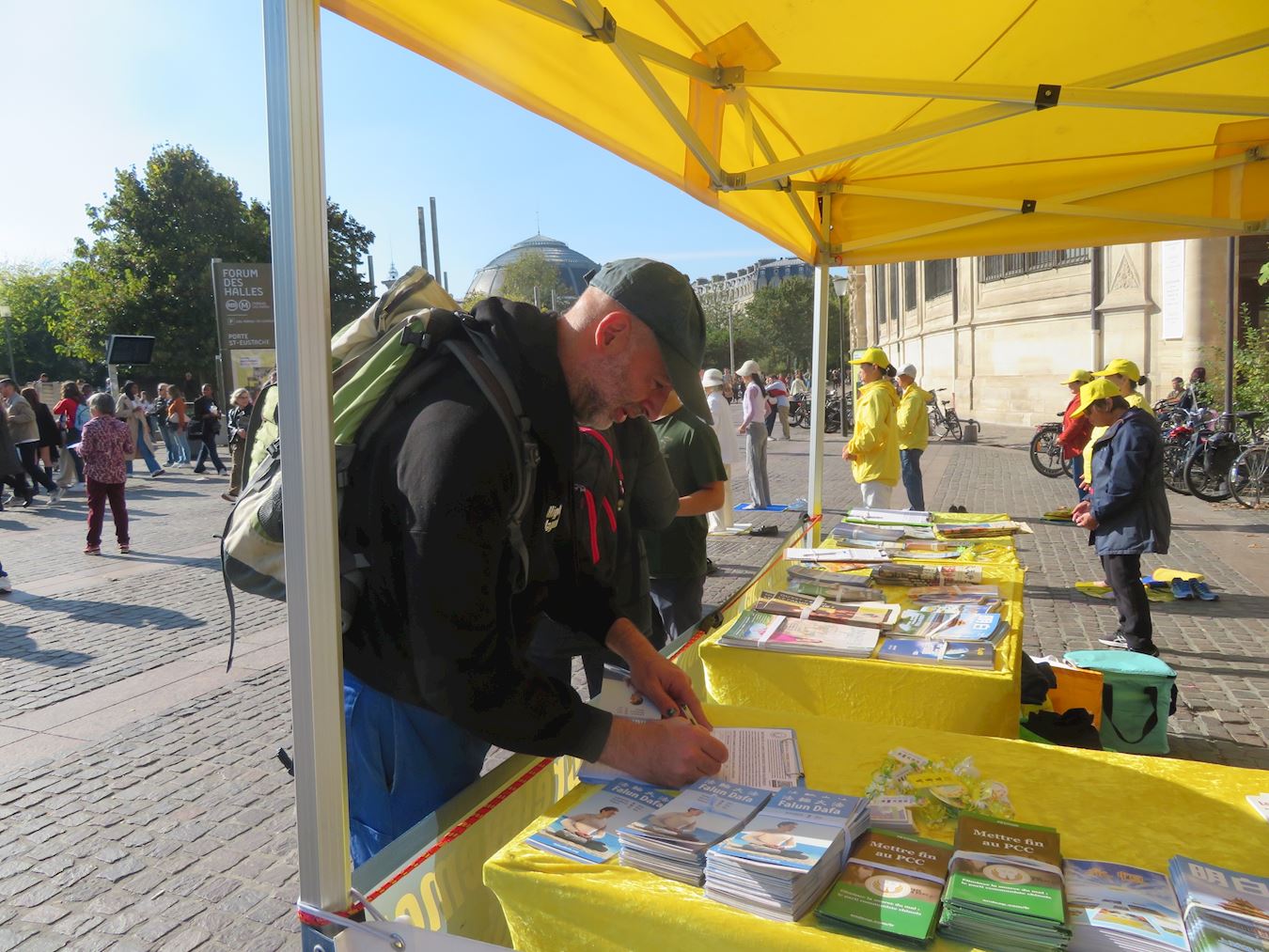 تمرینکنندگان فالون دافا در ۷اکتبر۲۰۲۵، فالون دافا را در منطقه بلویل پاریس معرفی کردند.