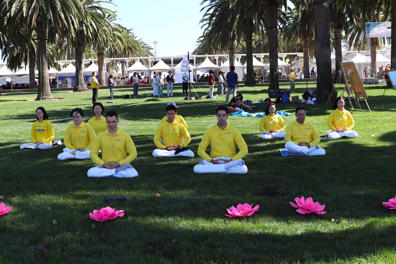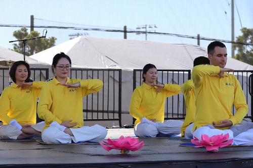 یکی از تمرینکنندگان فالون دافا روی صحنه تمرینها را معرفی کرد و توضیح داد که این تمرین چگونه سطح سلامتی و تندرستی او را بهبود بخشیده است. سپس تمرینکنندگان پنج تمرین را همراه با موسیقی آرامبخش مخصوص تمرین اجرا کردند.