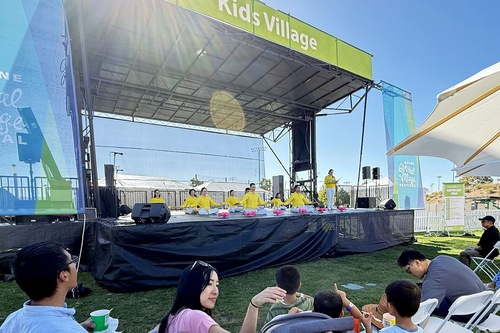 تمرینکنندگان فالون دافا پنج تمرین را روی صحنه و چمنزار در بیستوچهارمین جشنواره دهکده جهانی ارواین در تاریخ ۱۱اکتبر۲۰۲۵ به نمایش گذاشتند.