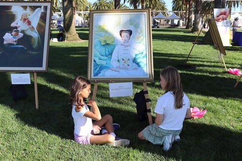 تمرینکنندگان نقاشیهایی از نمایشگاه بینالمللی هنر حقیقت، نیکخواهی، بردباری را در چمنزار به نمایش گذاشتند. مردم برای تماشای آنها توقف کردند و سؤالاتی پرسیدند. درحالیکه دو زن در حال پرسیدن سؤال بودند، دخترانی که همراهشان بودند برای دیدن نقاشیها رفتند و سپس نشستند و همان حرکت مدیتیشنِ شخصیت درون نقاشی را انجام دادند. یکی از تمرینکنندگان جوان جلو آمد تا حرکات را به آنها آموزش دهد و آنها با گلهای لوتوس کوچک بهعنوان هدیه با خوشحالی آنجا را ترک کردند.