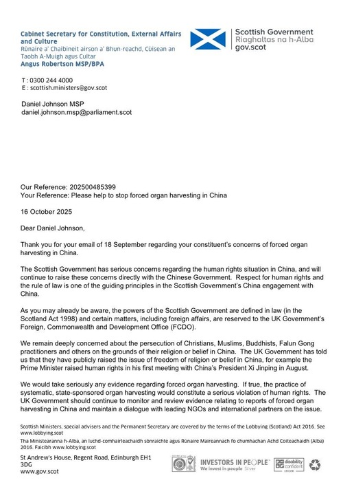 اَنگِس رابرتسون، دبیر کابینه در امور قانون اساسی، امور خارجی و فرهنگ اسکاتلند، در نامهای به دنیل جانسون، عضو پارلمان اسکاتلند (MSP)، در تاریخ ۱۶اکتبر۲۰۲۵ نوشت: «دولت اسکاتلند درباره وضعیت حقوق بشر در چین نگرانیهای جدی دارد و همچنان این نگرانیها را مستقیماً با دولت چین در میان خواهد گذاشت. احترام به حقوق بشر و حاکمیت قانون یکی از اصول راهنمای تعامل دولت اسکاتلند با چین است.»