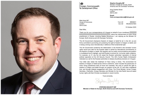 وی درباره آزار و شکنجه فالون گونگ در روسیه تحت نفوذ ح.ک.چ، گفت: «دولت بریتانیا وخامت وضعیت حقوق بشر در داخل روسیه را محکوم میکند و از دولت روسیه میخواهد به تعهدات بینالمللی خود درباره آزادی مذهب یا عقیده پایبند باشد. ما از طریق مواضع عمومی و جایگاهمان در مجامع چندجانبه، مرتباً موارد نقض حقوق بشر توسط روسیه را بهطور برجسته مطرح میکنیم و خواستار پاسخگوشدن آن کشور هستیم. بهعنوان مثال، در ۳۱ژوئیه، بریتانیا سرکوب مخالفان سیاسی داخلی توسط مقامات روس را در شورای امنیت سازمان ملل مطرح کرد. سفیر حقوق بشر بریتانیا نیز در ۴اوت خواستار آزادی تمامی زندانیان سیاسی شد.»