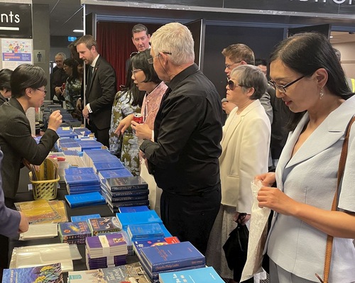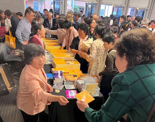 تمرینکنندگان در زمان استراحت کنفرانس، از غرفه فروشگاه کتاب تیانتی، کتابهای فالون دافا را خریداری کردند.