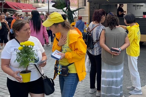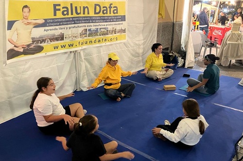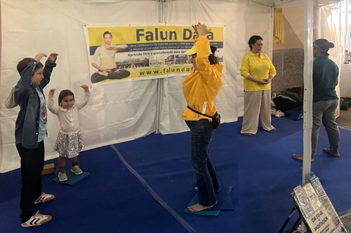 ماریا و خانوادهاش به توضیحات تمرینکنندهای درباره معرفی فالون دافا گوش دادند، ماندند تا تمرینات را یاد بگیرند و گفتند حس بسیار خوبی دارند.