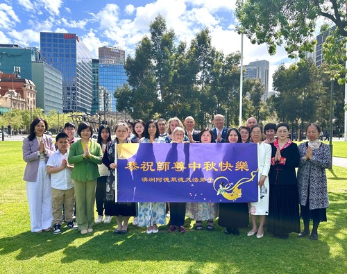 تمرینکنندگانی که در چاینا تاون آدلاید، استرالیا، به مردم درباره واقعیتهای آزار و شکنجه توضیح میدهند، جشن نیمه پاییز را به استاد تبریک گفتند.