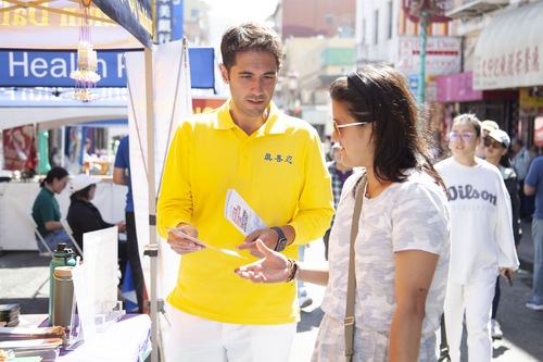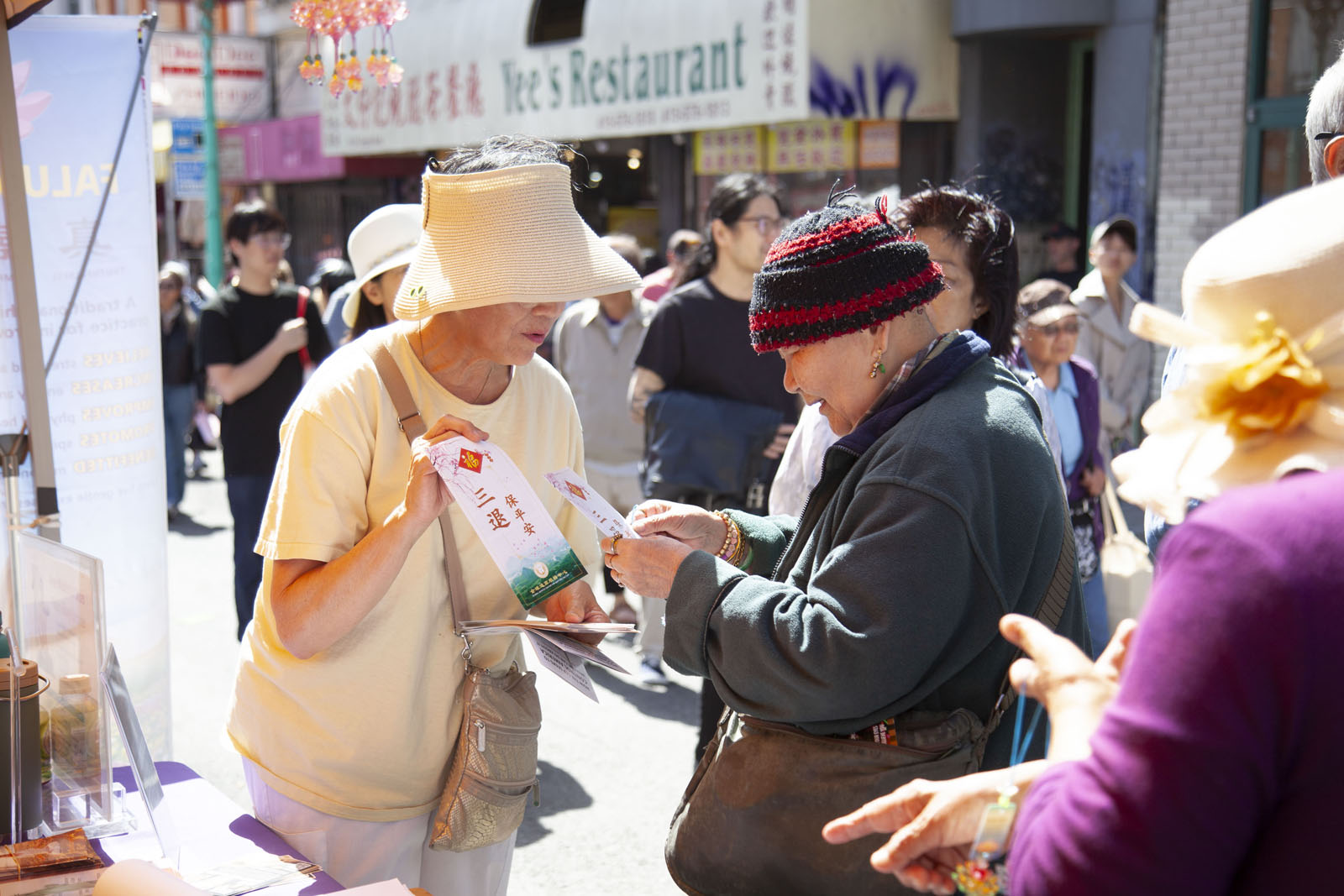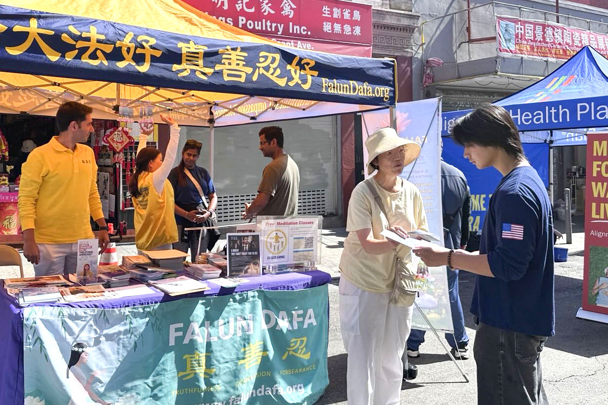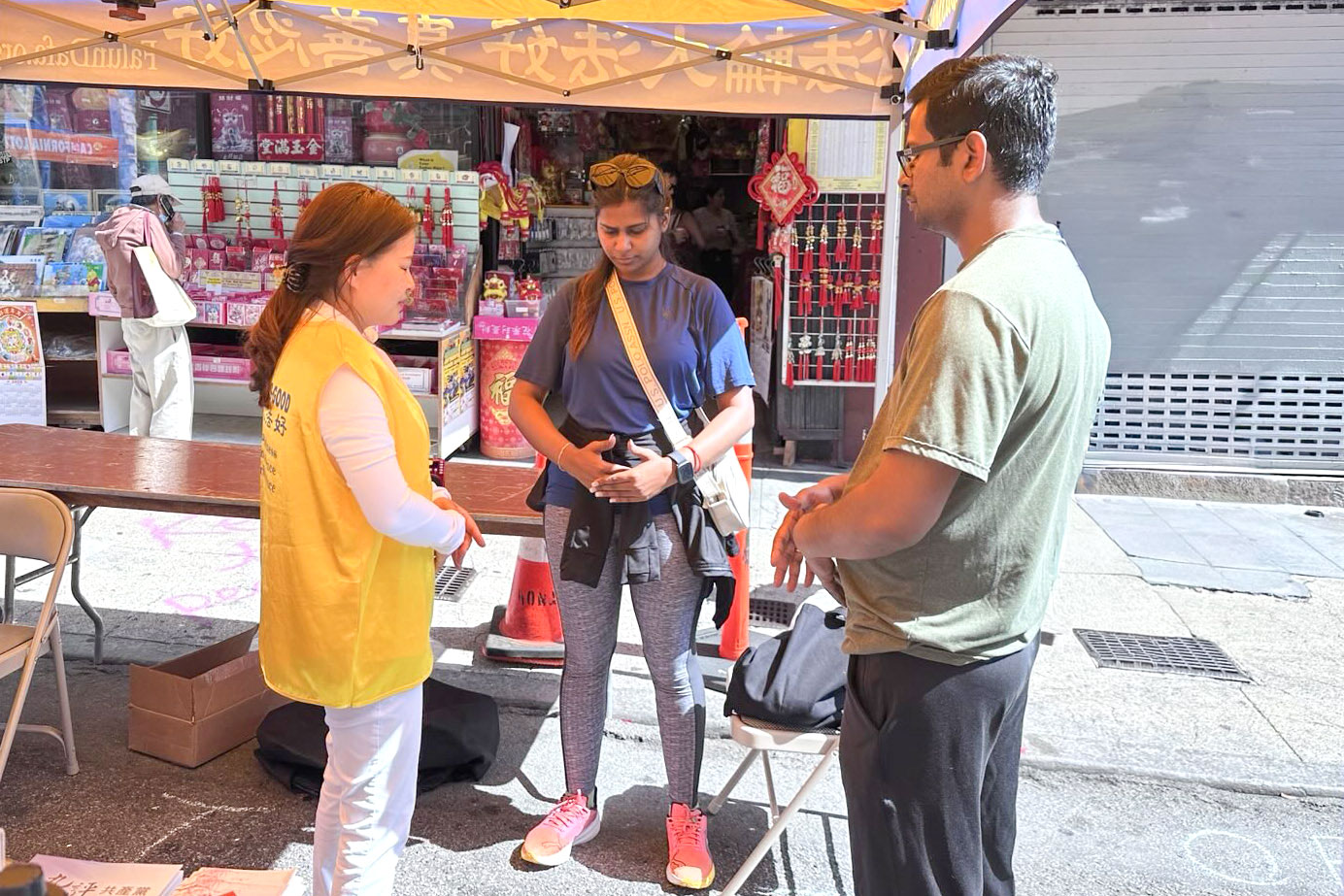 تمرینکنندگان در جشنواره نیمه پاییز محله چینیها در ۲۷ و ۲۸سپتامبر۲۰۲۵، با بازدیدکنندگان درباره فالون دافا و آزار و شکنجه آن بهدست ح.ک.چ گفتگو میکنند.
