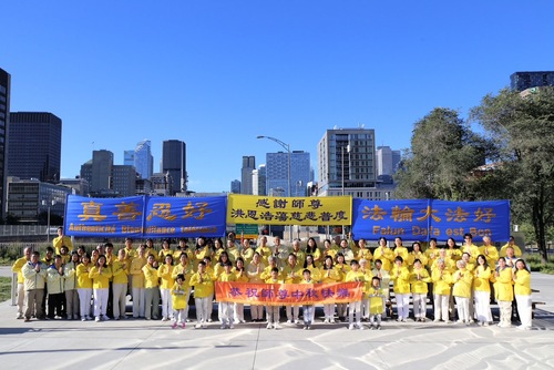 تمرینکنندگان فالون دافا در مونترال، با احترام جشن نیمه پاییز را به استاد لی تبریک میگویند.