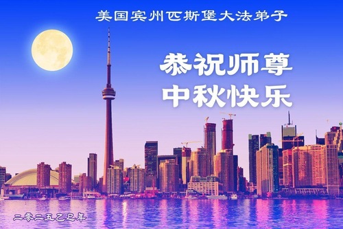 تمرینکنندگان فالون دافا در شهر پیتسبرگ، ایالات متحده، با احترام جشن نیمه پاییز را به استاد تبریک گفتند!