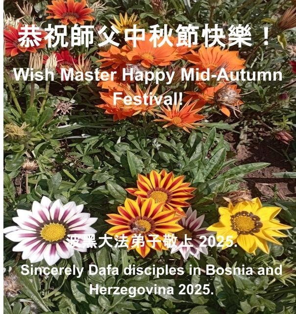 تمرینکننده فالون دافا در ایران نوشت: «استاد عزیز و نیکخواه، فرارسیدن جشن نیمه پاییز را به شما تبریک میگویم و امیدوارم تمام تمرینکنندگان فالون دافا، از جمله خودم، صادقانه به عهدمان پایبند بمانیم، بهخوبی تزکیه کنیم و موجودات ذیشعور را نجات دهیم تا بتوانیم همراه شما به خانه حقیقیمان بازگردیم.»