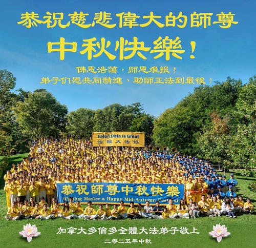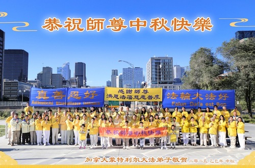 تمرینکنندگان فالون دافا در مونترآل، کانادا، جشن نیمه پاییز را به استاد لی تبریک گفتند!