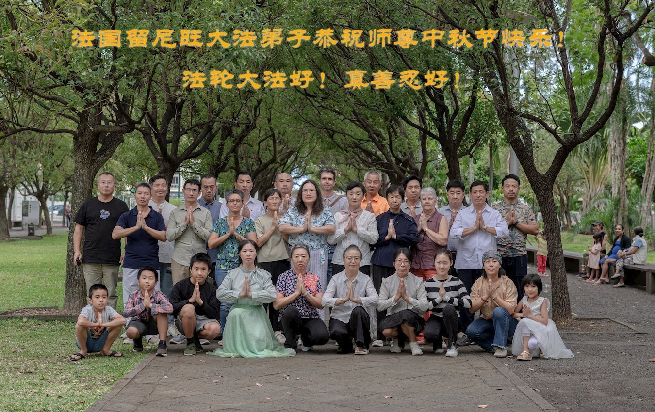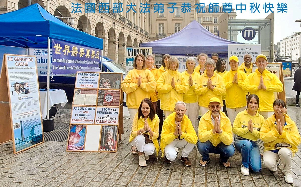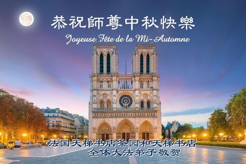 تمرینکنندگان فالون دافا در کتابفروشی تیانتی در فرانسه، جشن نیمه پاییز را به استاد تبریک گفتند!