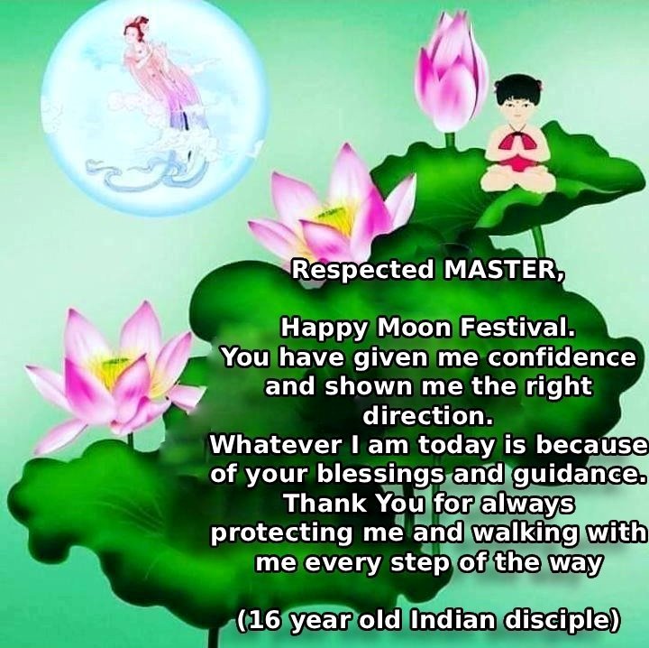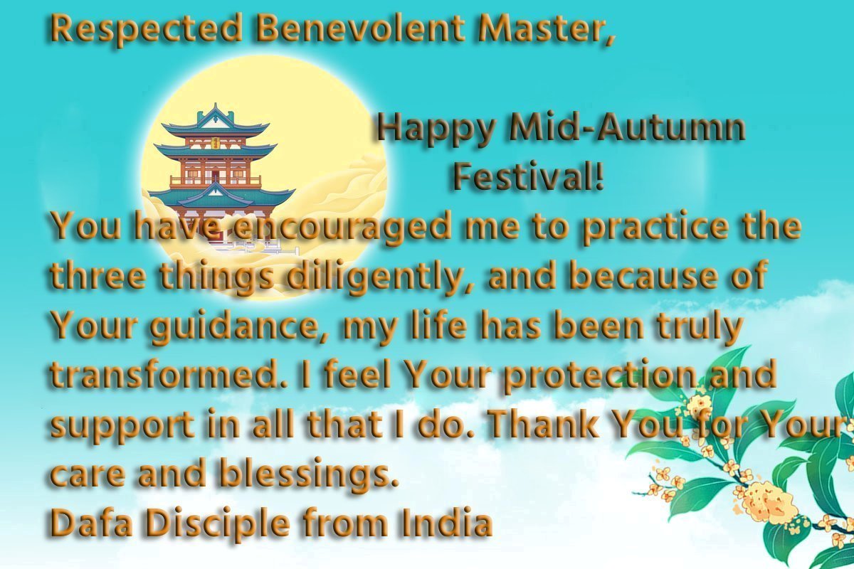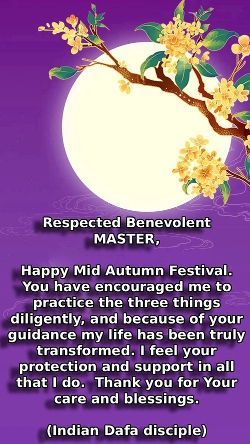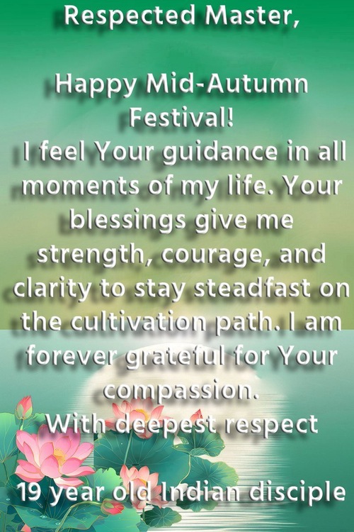استاد محترم و نیکخواه،جشن نیمه پاییز مبارک!شما مرا تشویق کردهاید تا سه کار را با پشتکار انجام دهم و بهدلیل راهنماییهای شما، زندگیام واقعاً متحول شده است. در هر کاری که انجام میدهم، حمایت و حفاظت شما را احساس میکنم. از لطف و برکات شما سپاسگزارم.