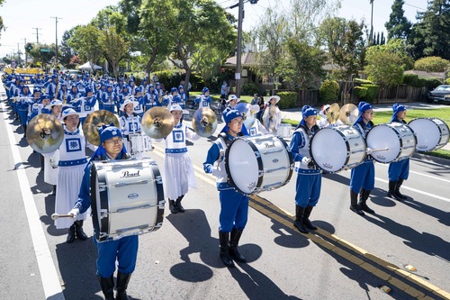 این راهپیمایی ساعت ۱۱صبح آغاز شد. صفوف تمرینکنندگان فالون دافا (فالون گونگ) شامل گروه مارش تیانگوئو، تیم نمایش تمرینات، تختروان متحرک و گروه طبلکمری بود.