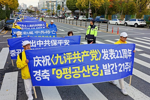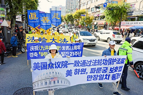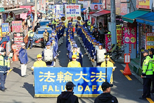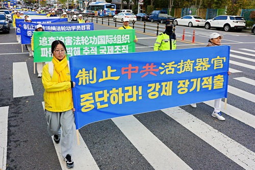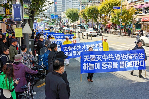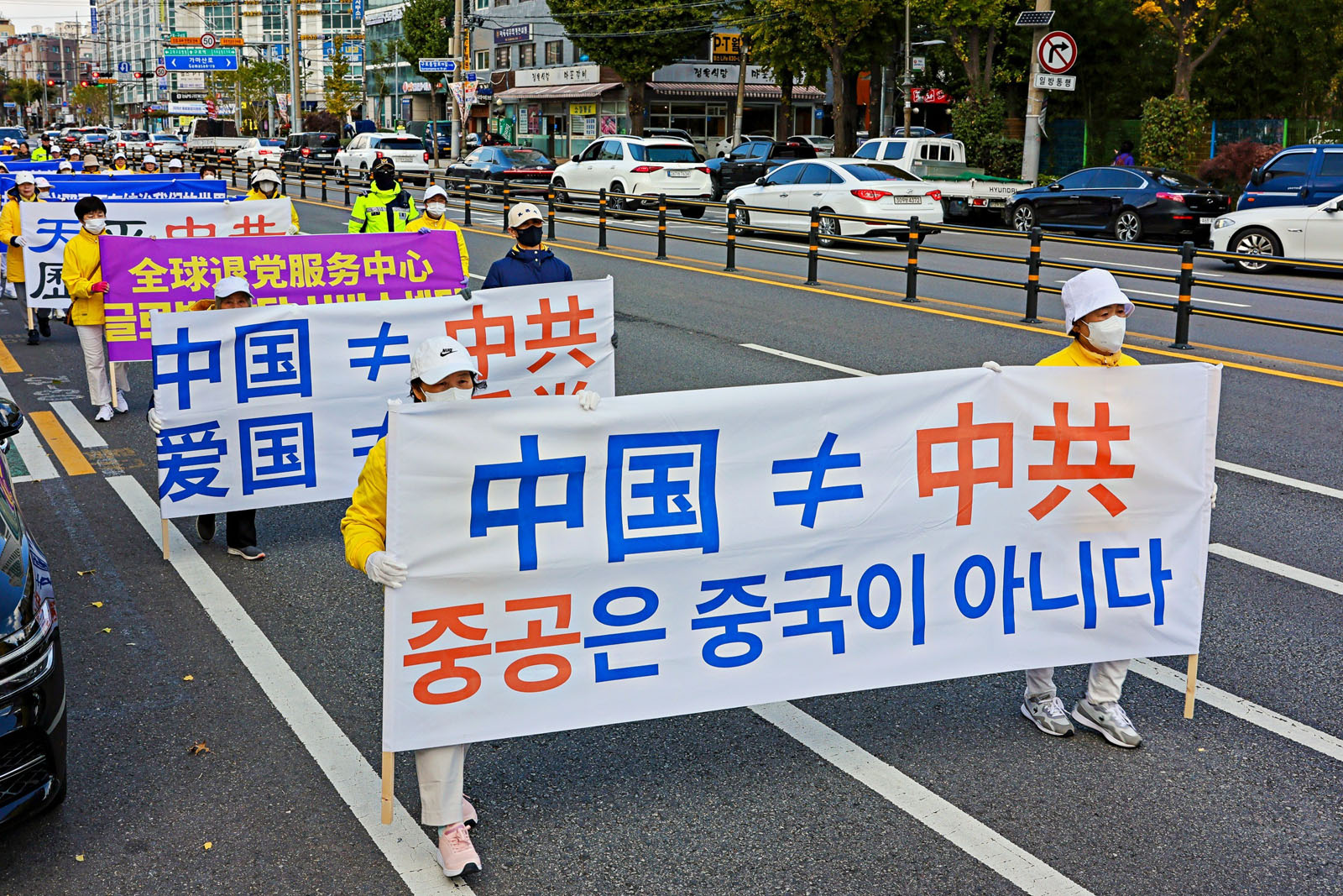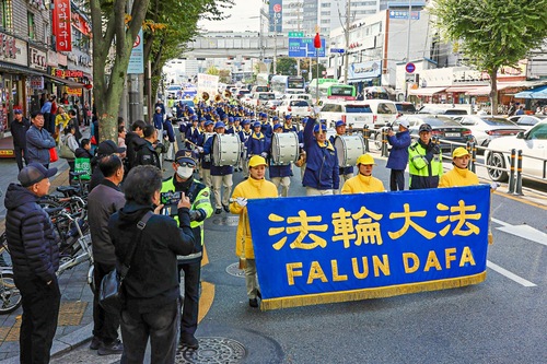 تمرینکنندگان در تاریخ ۲نوامبر، در گورو-دونگ و دائریم-دونگ، بزرگترین جامعه چینی در سئول (کرهجنوبی)، راهپیمایی کردند.