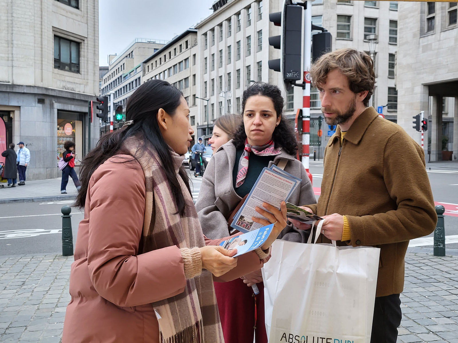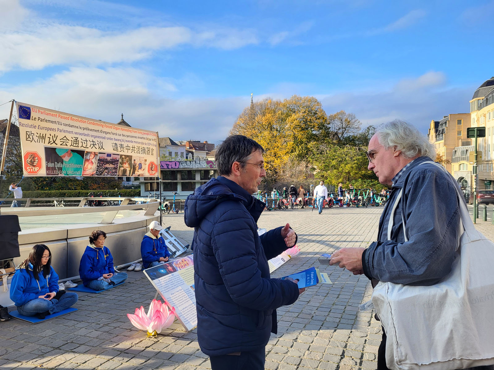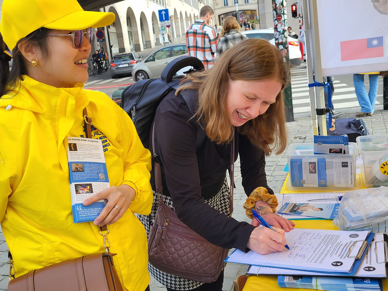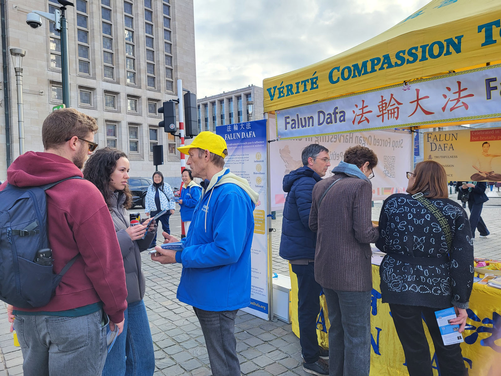 مارین که در انجمن فرهنگ و تبادلات بینالمللی فرانسه کار میکند، مدت زیادی با یکی از تمرینکنندگان صحبت کرد. او و دوستش آن آخر هفته برای اولین بار در بلژیک، از موضوع آزار و شکنجه مطلع شدند. مارین پس از خواندن تابلوهای اطلاعرسانی گفت که احساس میکند باید کاری انجام دهد، مانند امضای دادخواست. او گفت مهم است که مردم بیشتری از این آزار و شکنجه مطلع شوند. «بهدلیل شغلم مایلم بیشتر بدانم.»