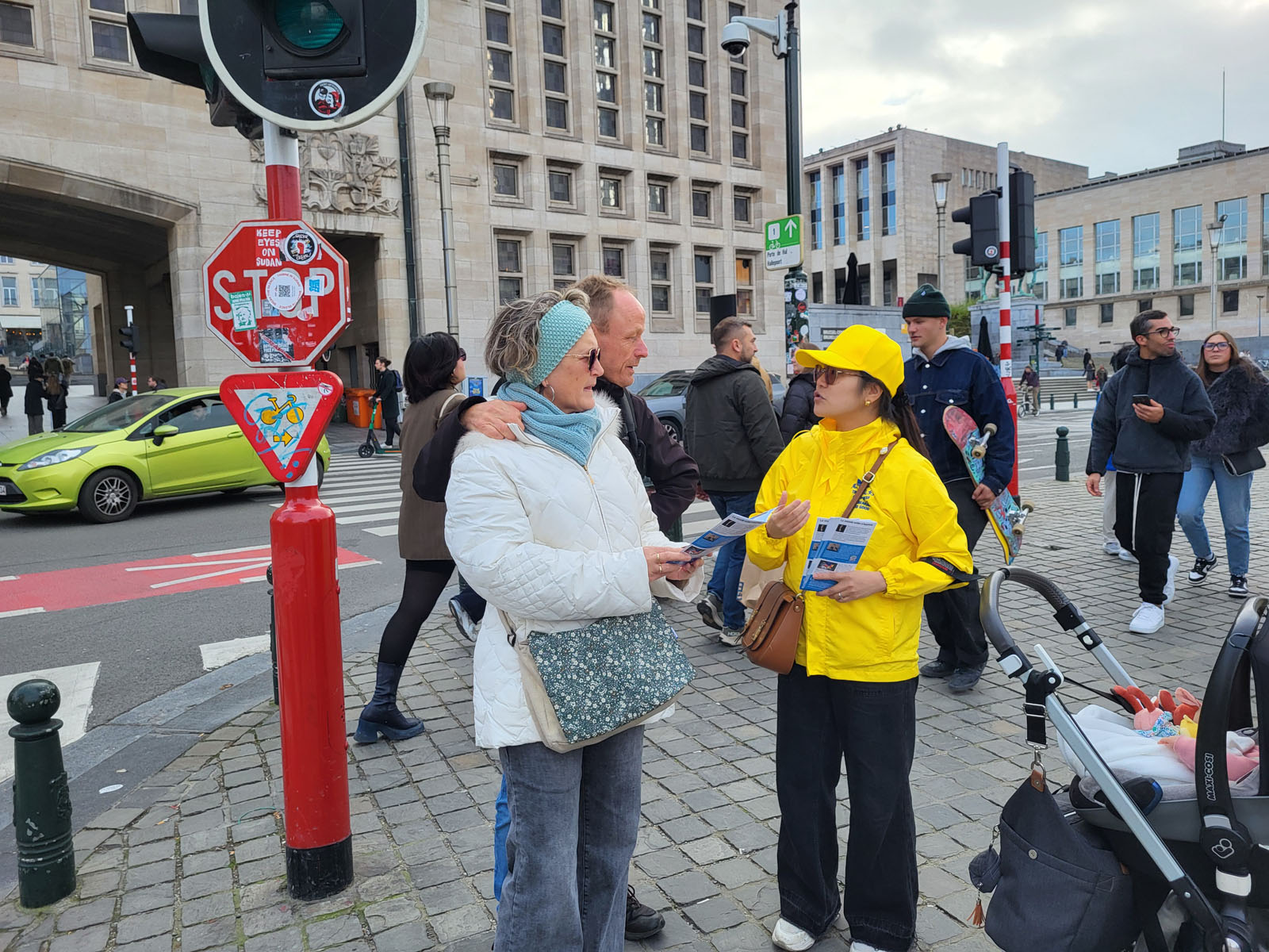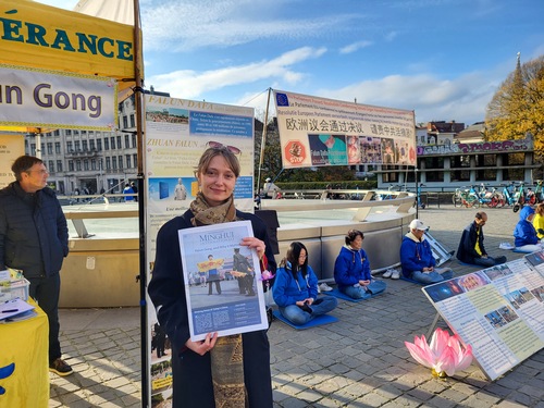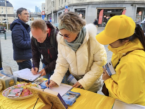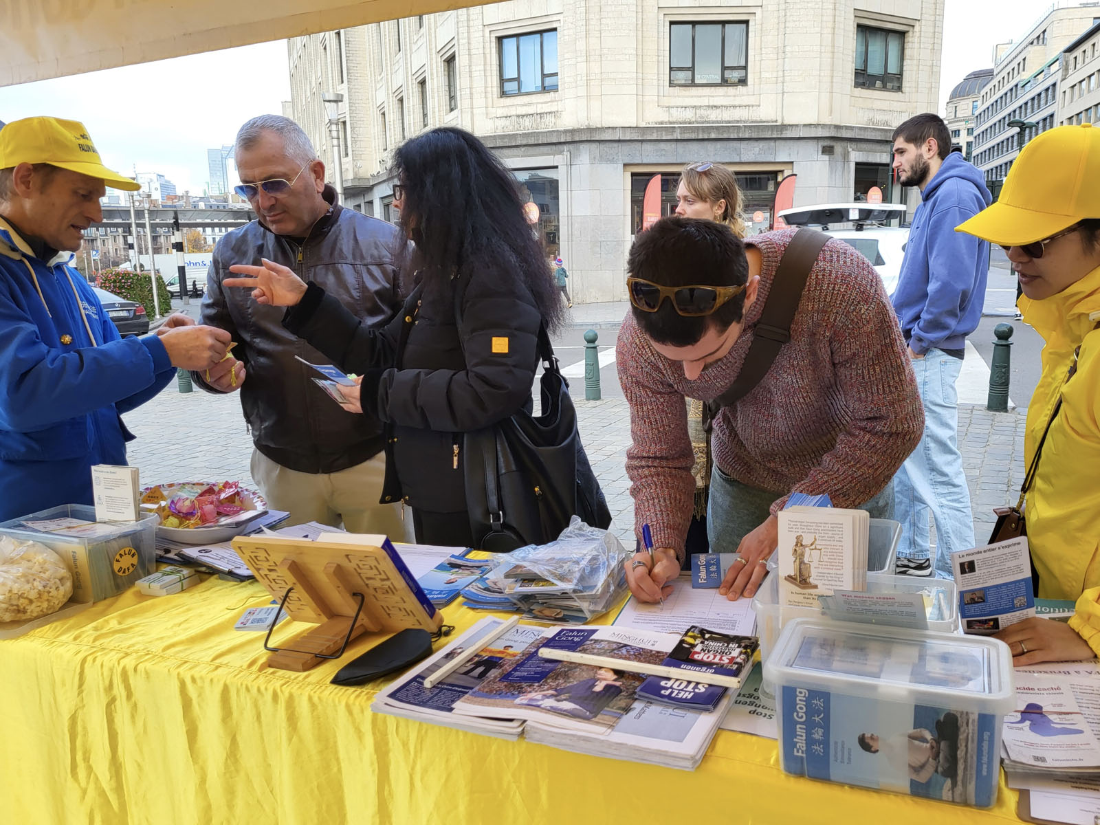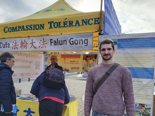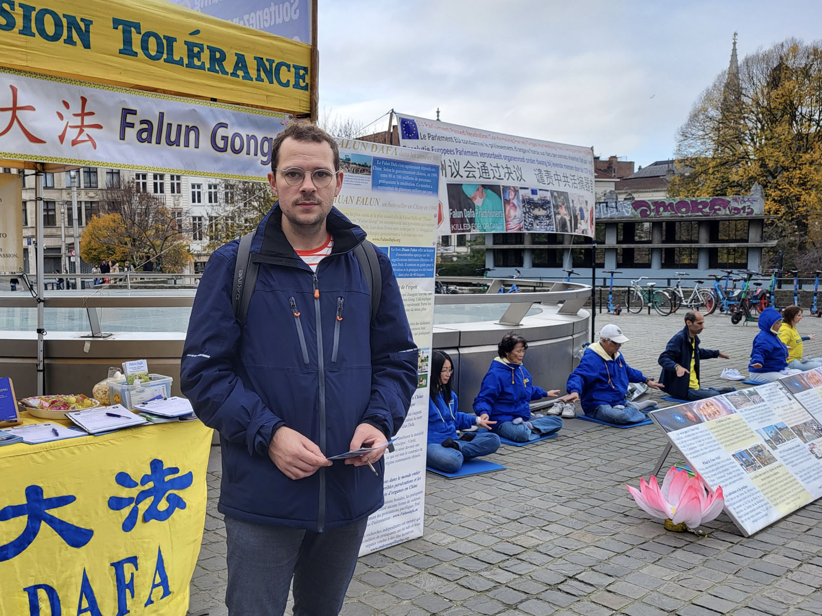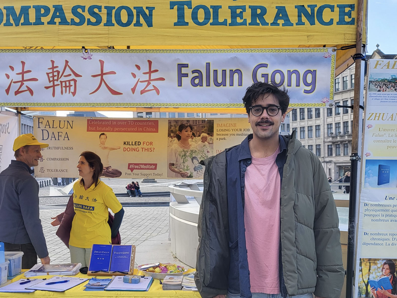 مارین که در انجمن فرهنگ و تبادلات بینالمللی فرانسه کار میکند، مدت زیادی با یکی از تمرینکنندگان صحبت کرد. او و دوستش آن آخر هفته برای اولین بار در بلژیک، از موضوع آزار و شکنجه مطلع شدند. مارین پس از خواندن تابلوهای اطلاعرسانی گفت که احساس میکند باید کاری انجام دهد، مانند امضای دادخواست. او گفت مهم است که مردم بیشتری از این آزار و شکنجه مطلع شوند. «بهدلیل شغلم مایلم بیشتر بدانم.»
