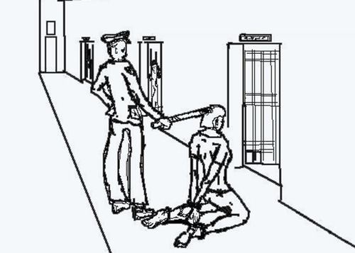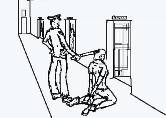 تصویری از شکنجه «دستبند متصل به پا»: پاهای قربانی با زنجیر بسته شده و دستانش از پشت بسته میشوند. دستبندها با زنجیر کوتاهی به پابندها متصل میشوند. قربانی مجبور میشود به عقب خم شود و روزها یا هفتهها بهصورت شبانهروزی در آن حالت باقی بماند.