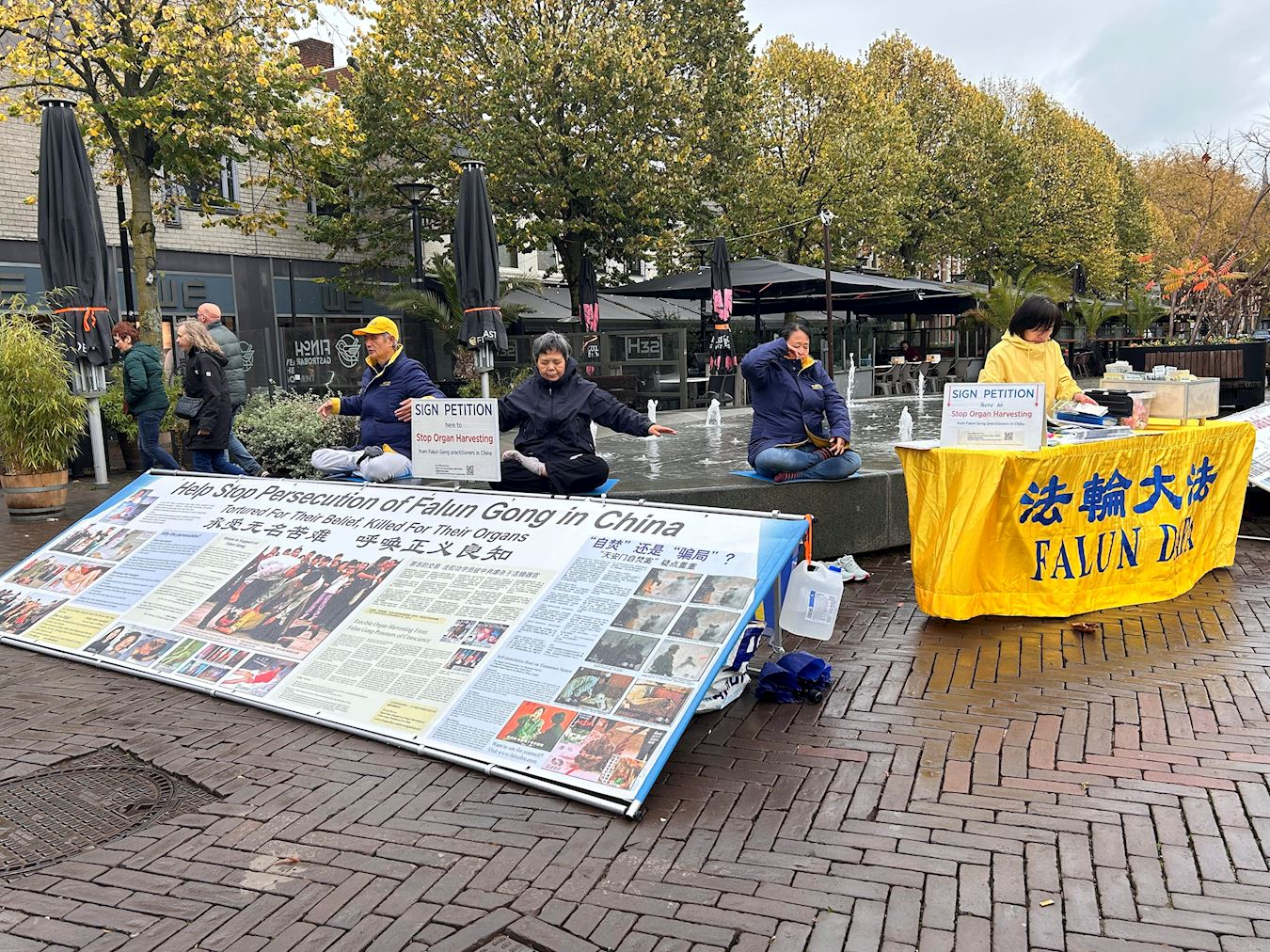 تمرینکنندگان در تاریخ ۲۵اکتبر۲۰۲۵ غرفههایی برپا کردند و تمرینهای فالون دافا را در خیابان هویوِل در شهر اوس، واقع در استان برابانت شمالی، به نمایش گذاشتند. با وجود باران، بسیاری از رهگذران ایستادند، با تمرینکنندگان صحبت و درباره فالون دافا اطلاعات بیشتری کسب کردند.
