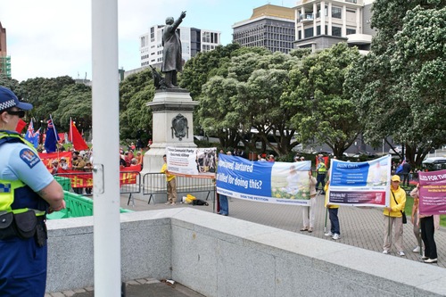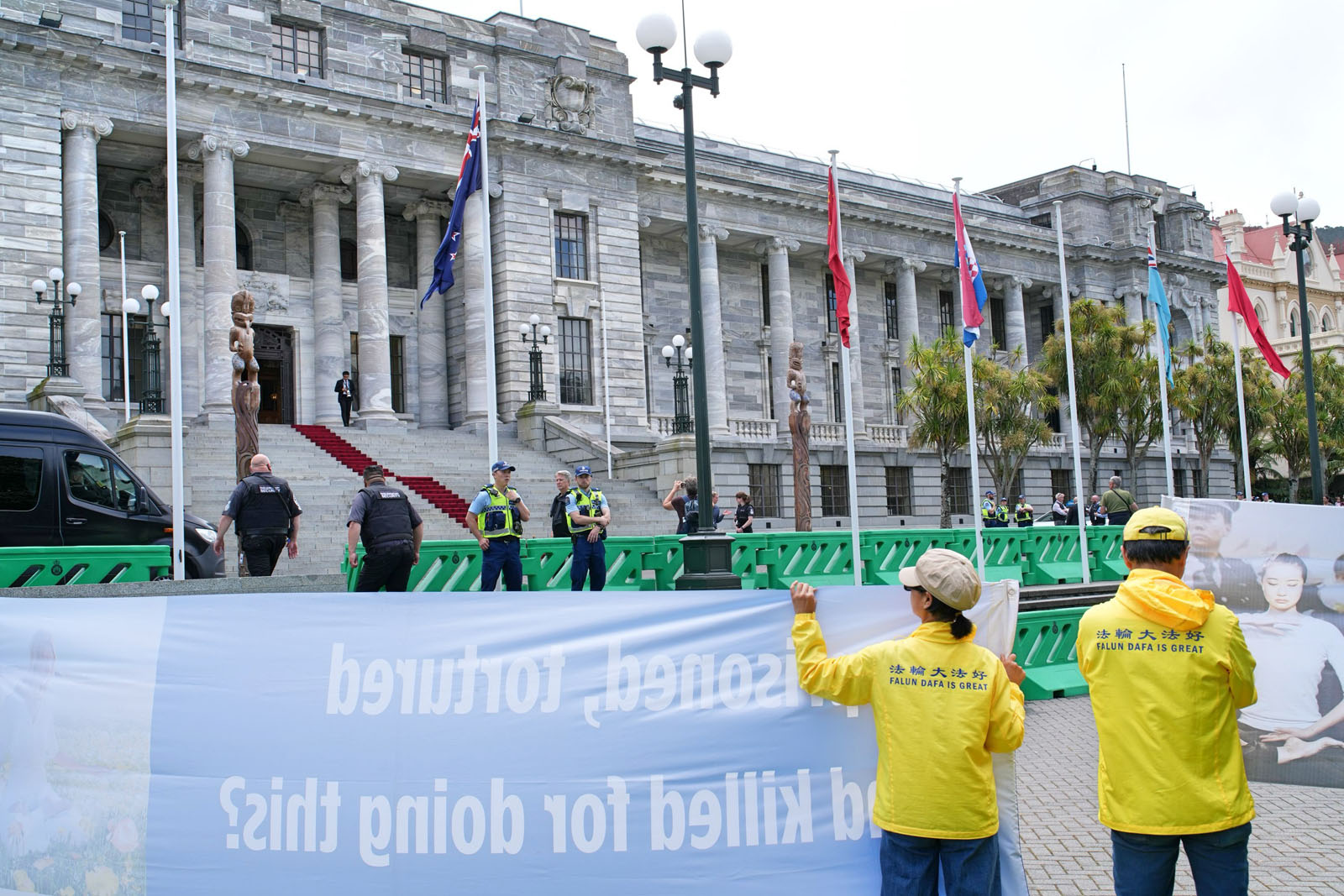 تمرینکنندگان فالون گونگ در مقابل ساختمان پارلمان نیوزیلند در ۲۰نوامبر۲۰۲۵، در جریان سفر ژائو لِجی تجمع صلحآمیزی برگزار کردند.