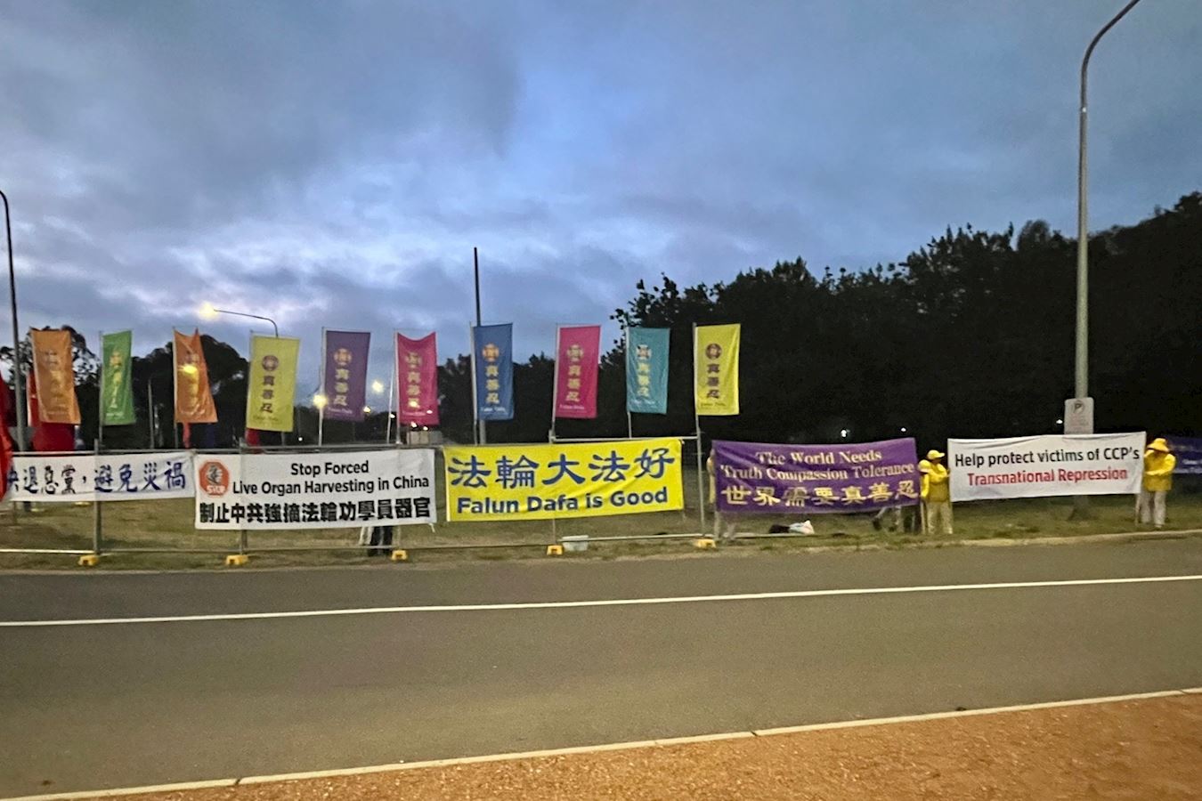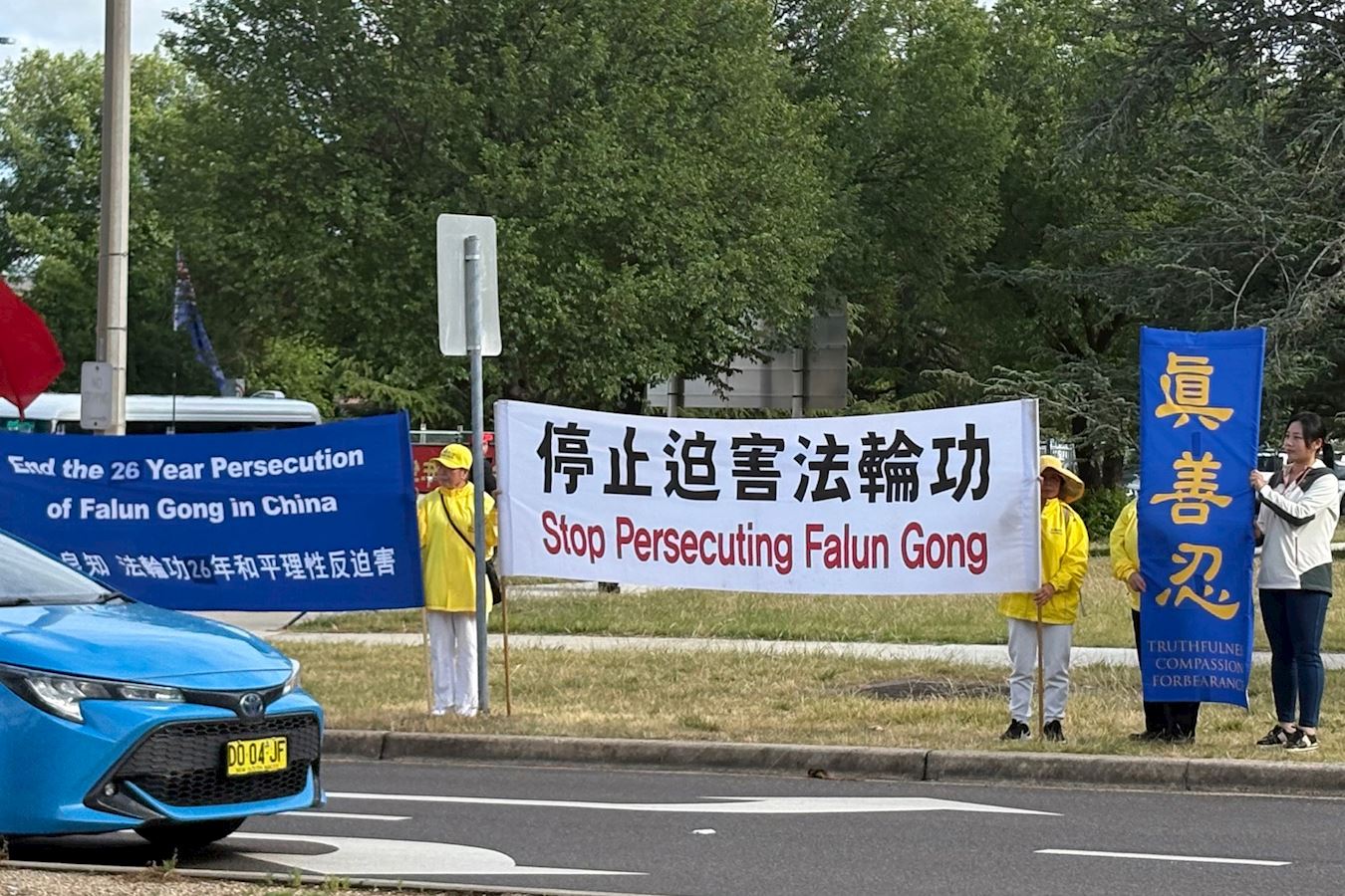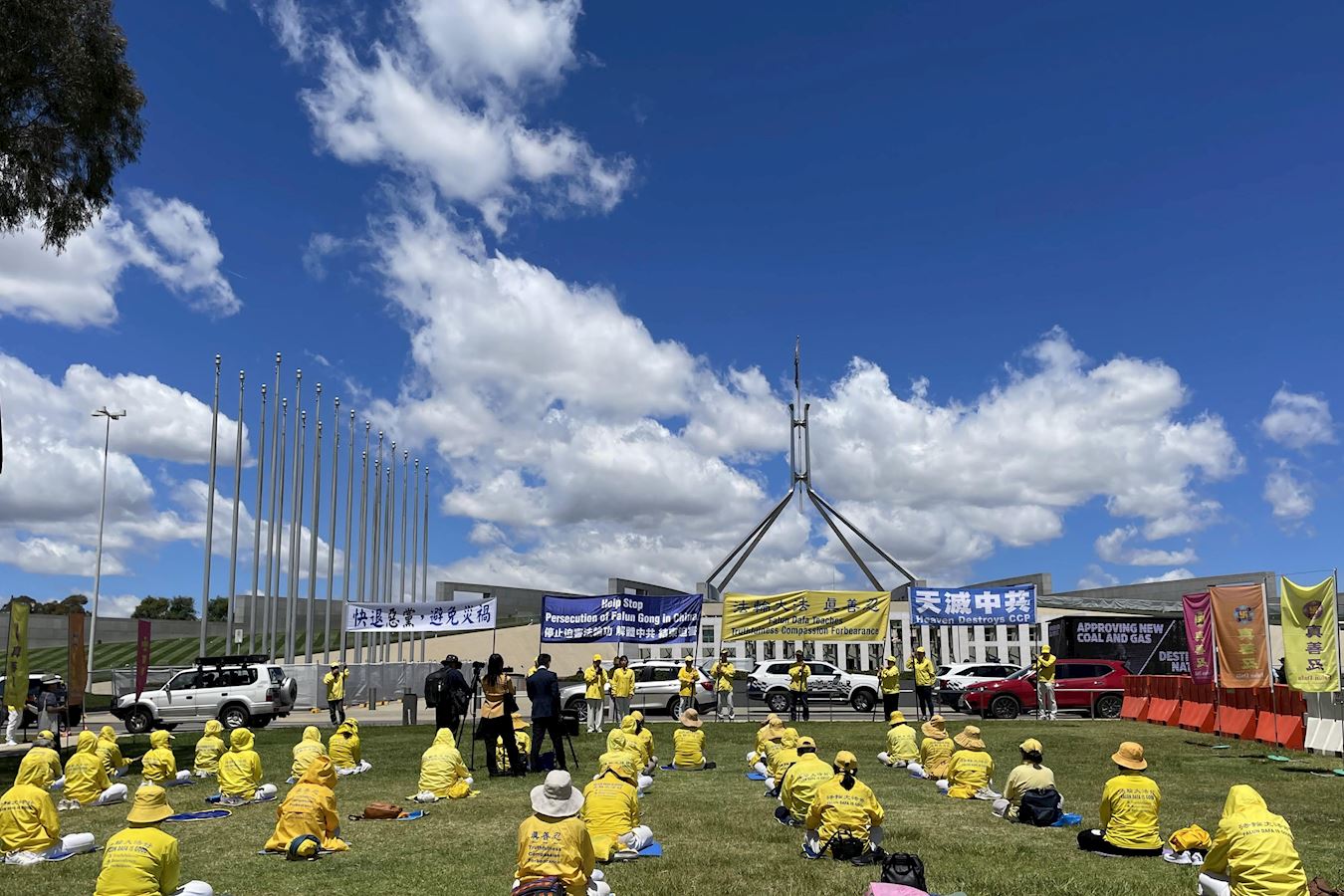 تمرینکنندگان فالون دافا در ۲۴نوامبر۲۰۲۵، در مقابل ساختمان پارلمان در کانبرا، تجمعی برگزار کردند تا به سفر ژائو لِجی اعتراض کنند.