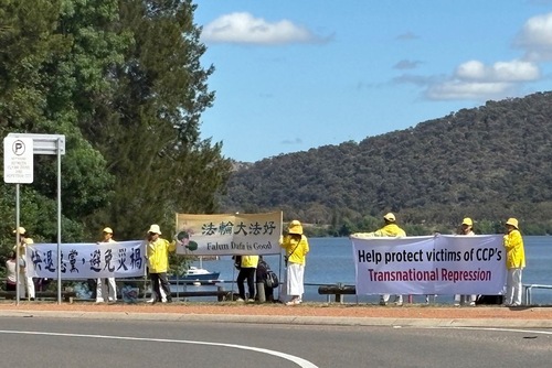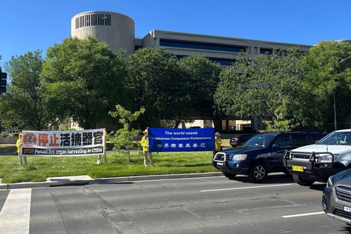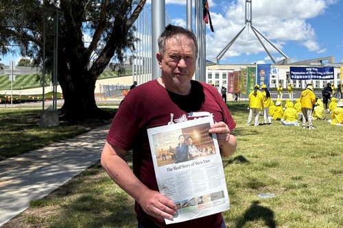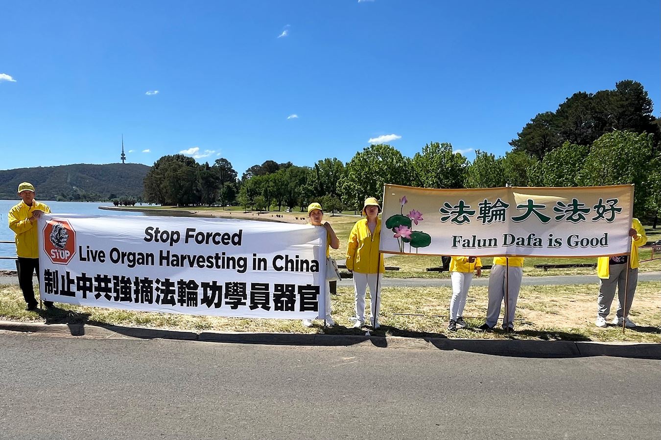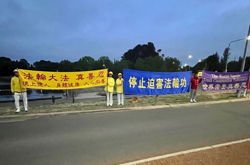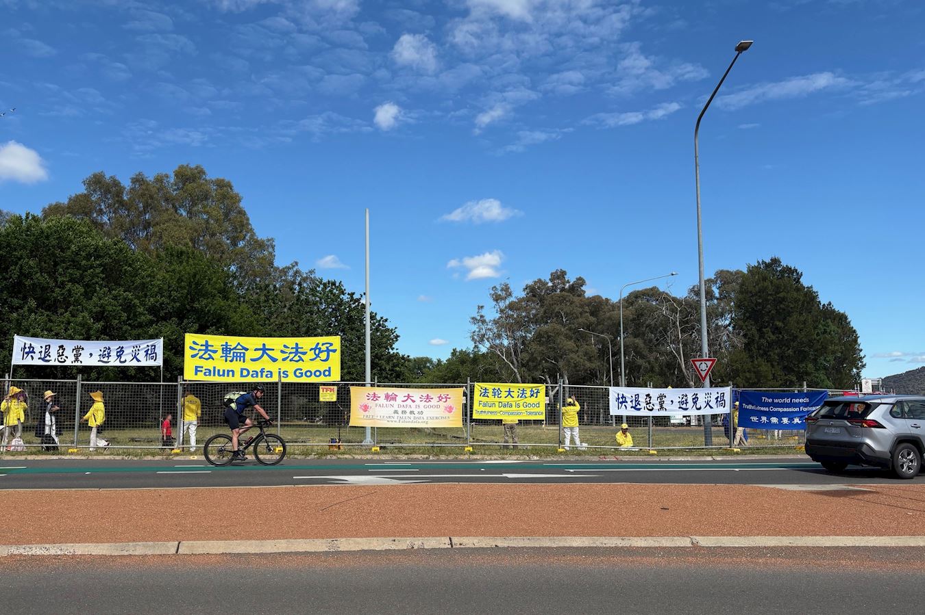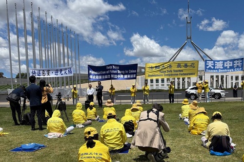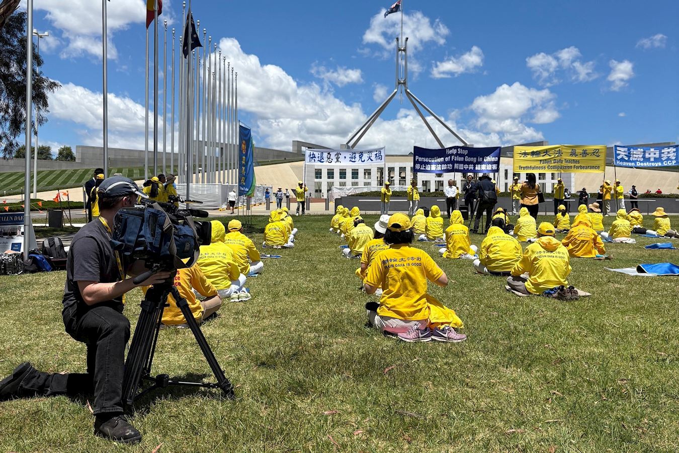 تمرینکنندگان فالون دافا در ۲۴نوامبر۲۰۲۵، در مقابل ساختمان پارلمان در کانبرا، تجمعی برگزار کردند تا به سفر ژائو لِجی اعتراض کنند.