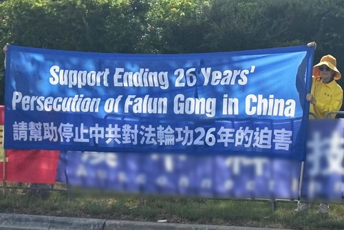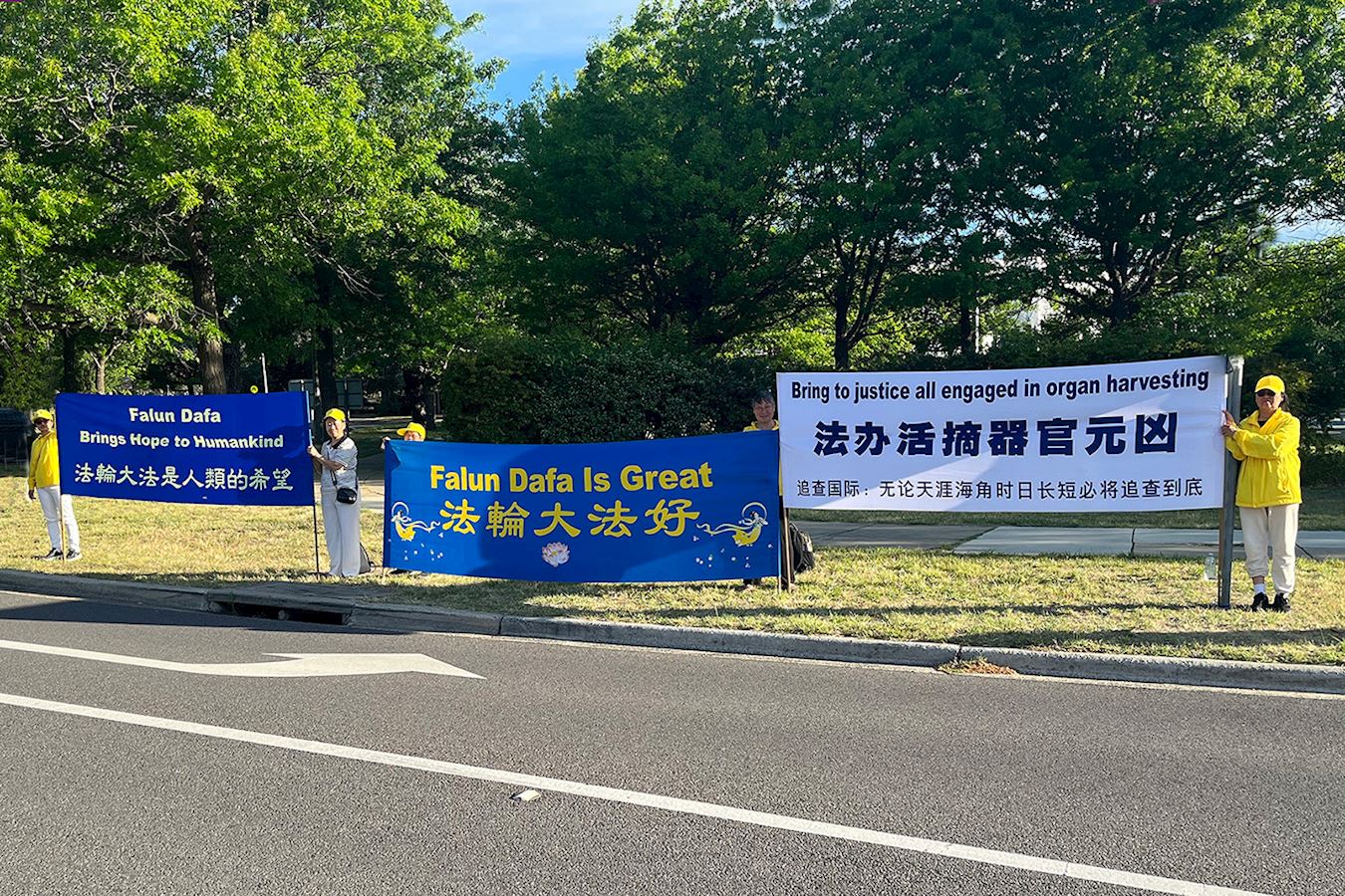تمرینکنندگان در ۲۵نوامبر۲۰۲۵، در کنار جادهای نزدیک سفارت چین بنرهایی در دست داشتند.