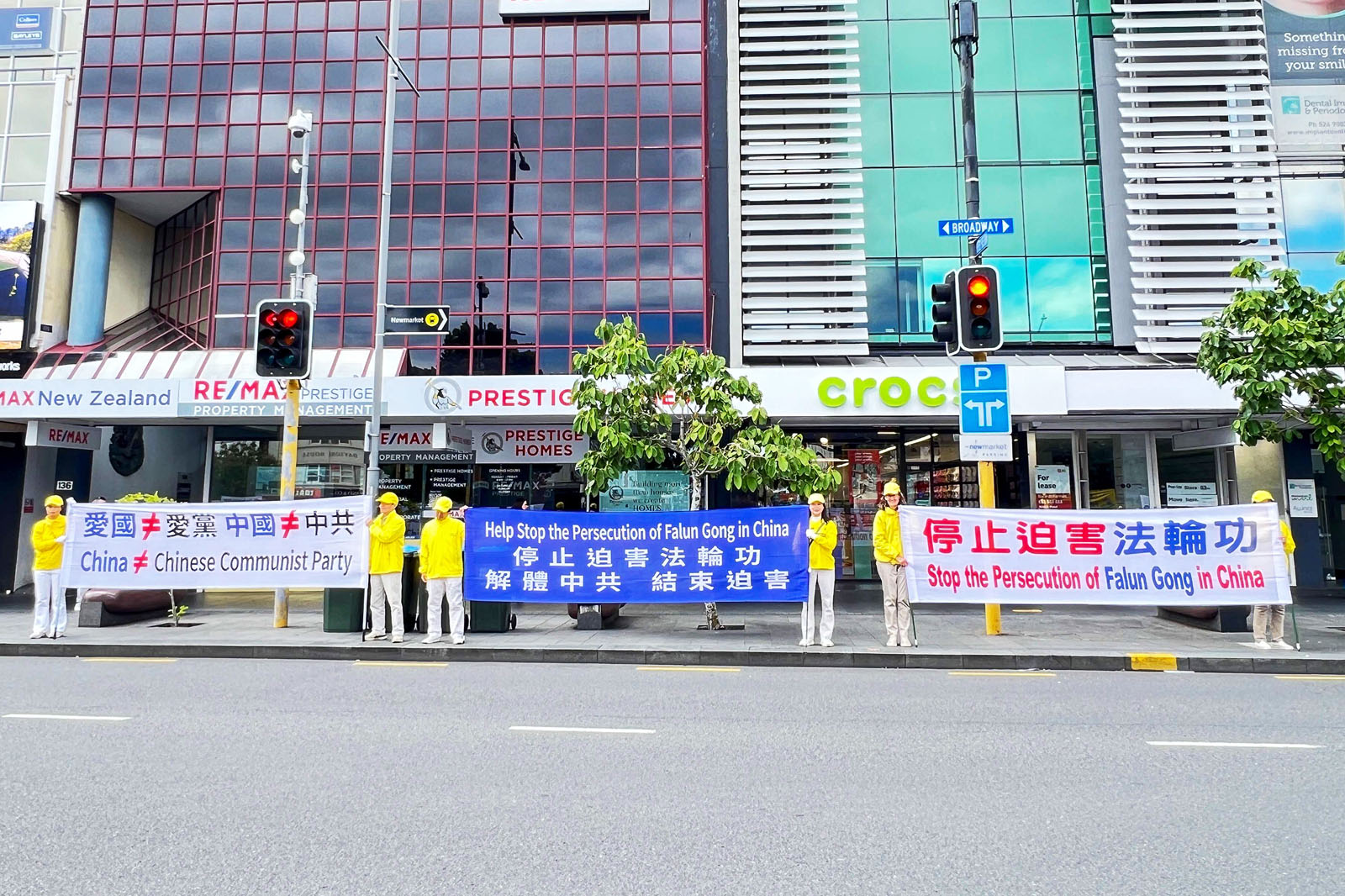 تمرینکنندگان بنرهایی با اطلاعات مربوط به فالون دافا در نیومارکت، مرکز تجاری اوکلند، در دست داشتند.
