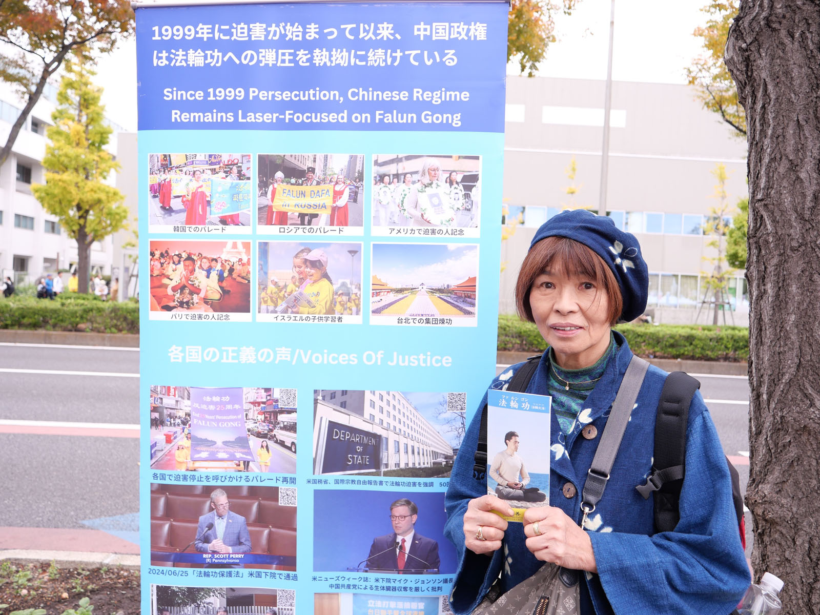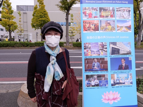 خانم یاسودا، مربی گروه «زیبایی کیمونو»، پس از گفتوگو با تمرینکنندگان و آشنایی با فالون گونگ گفت با اصول حقیقت، نیکخواهی، بردباری موافق است. او گفت در روزهای تعطیل، به کلاس آموزشی در مرکز اجتماع محلی کوبه میرود تا تمرینات را بیاموزد و با تمرینکنندگان اطلاعات تماس ردوبدل کند.