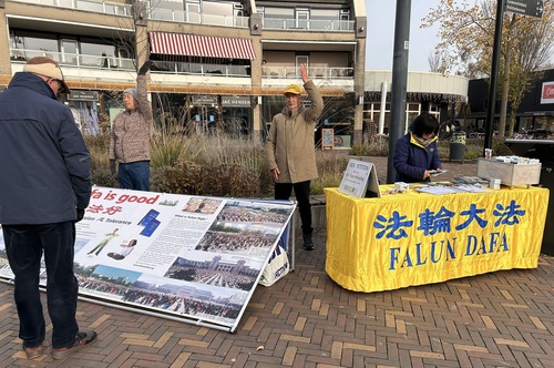 رهگذران توقف میکردند تا درباره فالون دافا و آزار و شکنجه آن بهدست ح.ک.چ، اطلاعات کسب کنند.