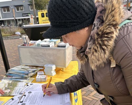 مردی تابلوهای نمایش اطلاعات را خواند و گفت که ح.ک.چ مردم را از آزادی باور محروم میکند، تمرینکنندگان فالون گونگ را بهطور وحشیانهای آزار و شکنجه میکند و یک رژیم بیرحم است. او پرسید چه کاری میتواند برای کمک انجام دهد و سپس دادخواست را امضا کرد.
