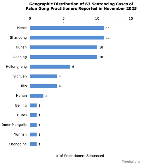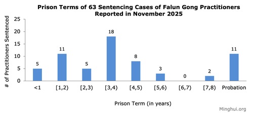 (Minghui.org) در مجموع ۶۳ مورد محکومیت تمرینکننده فالون گونگ به زندان بهدلیل ایمانشان، در نوامبر۲۰۲۵ گزارش شد؛ از این میان ۵۷ مورد مربوط به سال۲۰۲۵ و ۶ مورد مربوط به سالهای پیشین است. تأخیر در گزارشدادن بهدلیل سانسور اطلاعات در چین تحت حاکمیت رژیم کمونیست است که جمعآوری، تأیید و گزارشکردن دادهها را برای همکاران مینگهویی دشوار میکند.