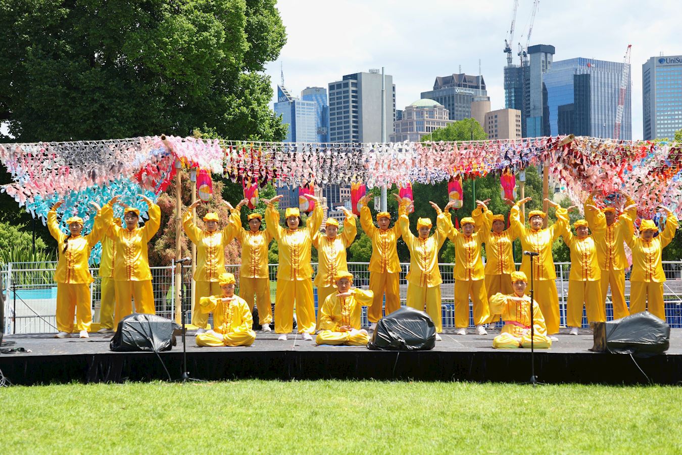 تمرینکنندگان فالون دافا به این جشنواره دعوت شدند. آنها دو بار روی صحنه رفتند؛ یک بار در بعدازظهر و یک بار در شب. اجراها شامل نمایش پنج مجموعه تمرین فالون دافا، موسیقیِ گروه مارش تیان گوئو، طبل کمری، رقص اژدها، رقص بادبزن و رقص قومی با کلاه حصیری بود. این اجراها زیبایی و شادمانی فرهنگ سنتی شرق را به نمایش گذاشت. اجرای شبانه جمعیت زیادی را جذب کرد و تشویقها و هلهلههای پرشور ساکنان محلی را در پی داشت.