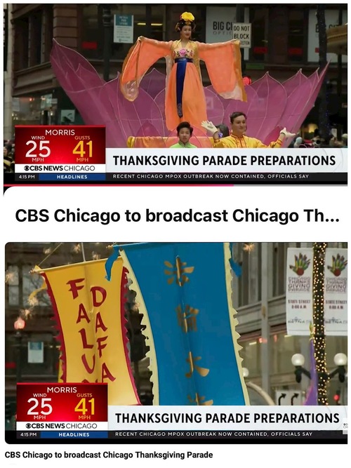 نمایش برجسته گروه فالون دافا در تیزر ۳۴ثانیهای سیبیاس شیکاگو از راهپیمایی۲۰۲۴. (ترکیبی از تصاویر اسکرینشات)