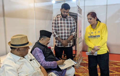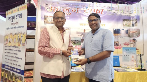 میهمان ویژه آقای ویشواس پاتیل (چپ) مطالب فالون دافا را از تمرینکنندهای دریافت میکند.