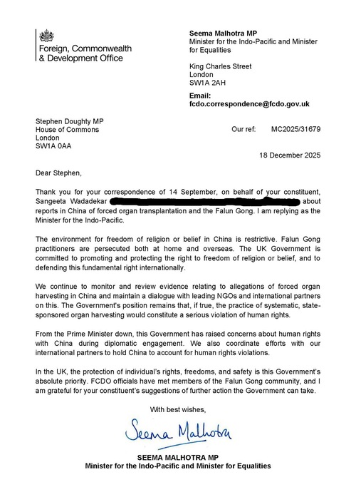 (Minghui.org) نماینده پارلمان سیما ملهوترا، وزیر امور هند-اقیانوس آرام، در نامه پاسخ خود به استیفن دوتی نماینده پارلمان، عضو مجلس عوام، در تاریخ ۱۸دسامبر۲۰۲۵ نوشت که حزب کمونیست چین (ح.ک.چ) فالون گونگ را هم در داخل کشور و هم در خارج از کشور مورد آزار و شکنجه قرار میدهد.