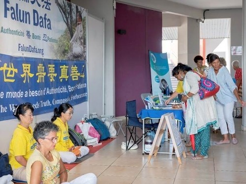 تمرینکنندگان در طول نمایشگاه سالمندان، که از ۱۲تا۱۴دسامبر۲۰۲۵، در مرکز نمایشگاهها و همایشهای آگوست لُگرو در سن-دنیِ جزیره رئونیونِ فرانسه برگزار شد، تمرینات فالون دافا را در غرفه خود به نمایش گذاشتند.