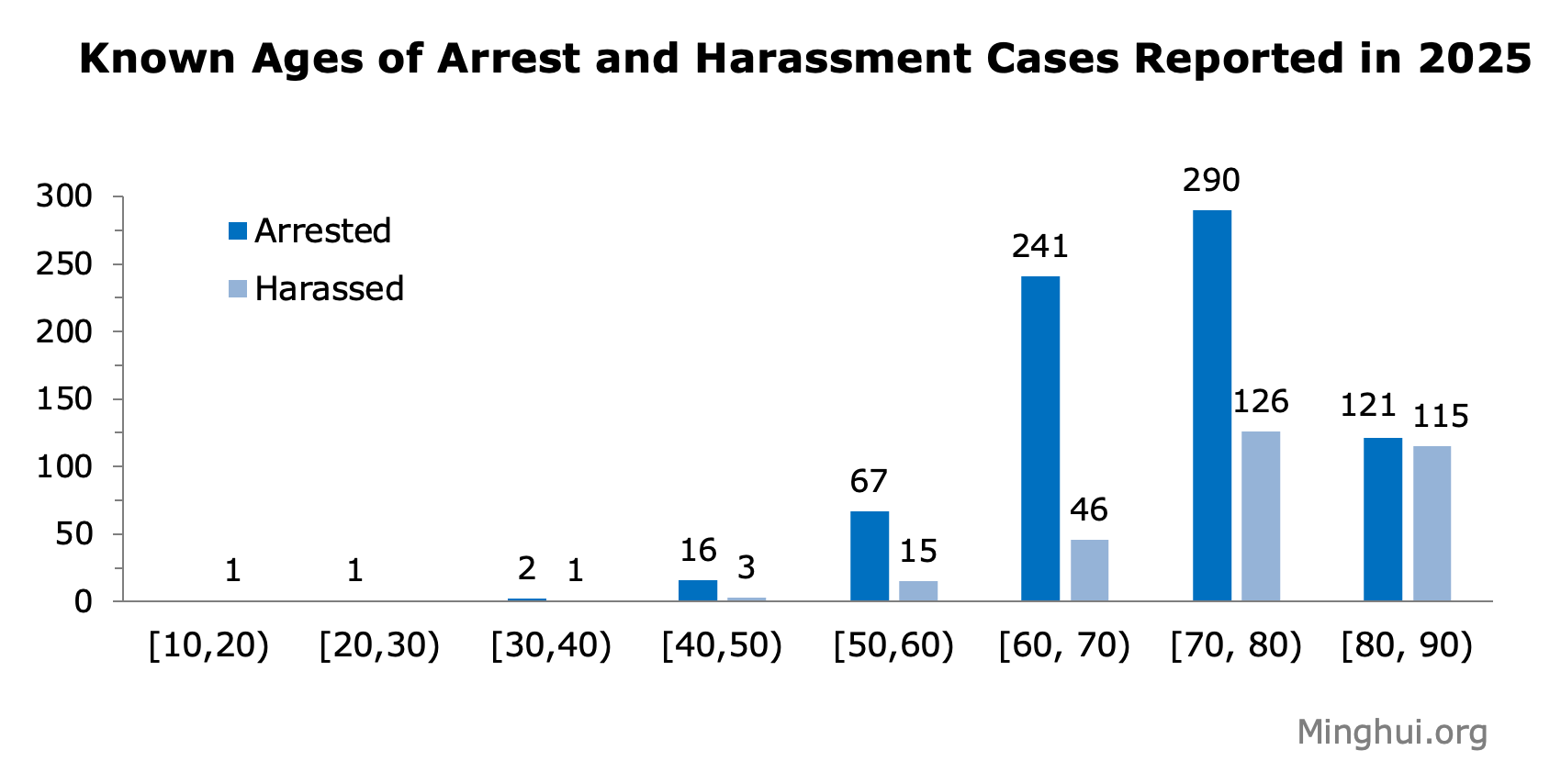 اطلاعات مربوط به سن 1053 نفر از 4803 تمرینکننده آزار و اذیت شده در دسترس بود. در میان این گروه، یک تمرینکننده در سنین نوجوانی، یک تمرینکننده در 20 سالگی، سه نفر در 30 سالگی، 19 نفر در 40 سالگی، 82 نفر در 50 سالگی، 287 نفر در 60 سالگی، 416 نفر در 70 سالگی، 236 نفر در 80 سالگی و هشت نفر در 90 سالگی بودند.