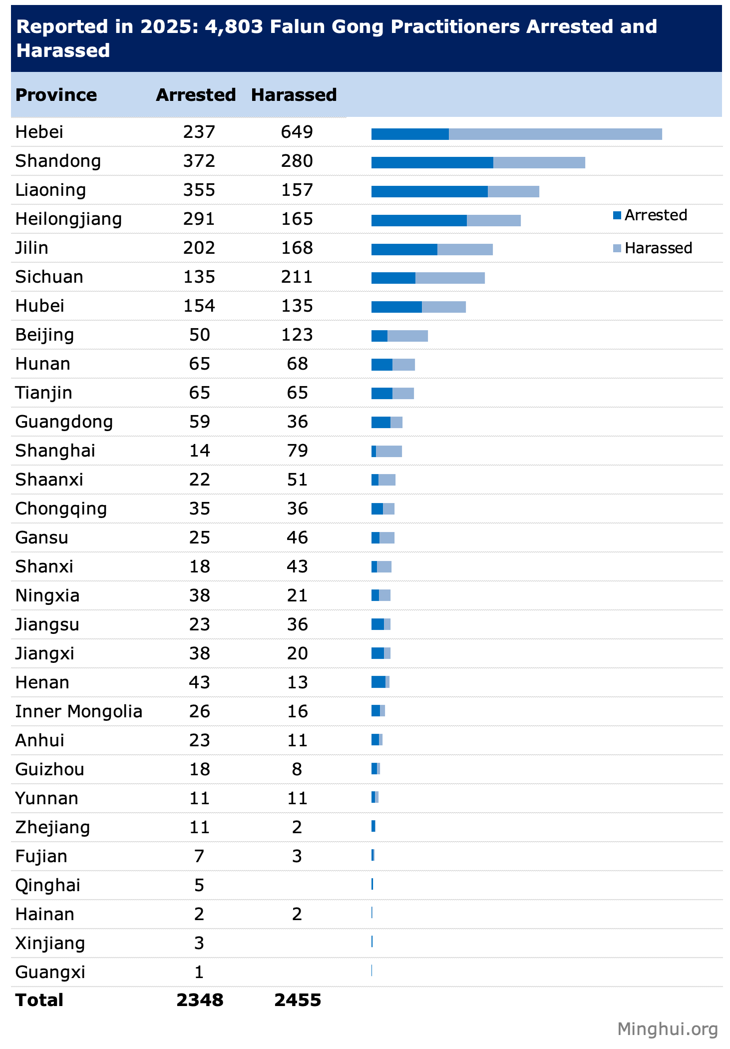 به ویژه، هبی، استانی که پکن را احاطه کرده است، بیشترین موارد را گزارش کرده است که در مجموع 886 مورد (شامل موارد بازداشت و آزار و اذیت) است. آزار و شکنجه در شاندونگ و لیائونینگ نیز شدید بود و به ترتیب 652 و 512 مورد گزارش شد. هفت منطقه دیگر نیز تعداد موارد سه رقمی بین 130 تا 456 را ثبت کردند. در مجموع 16 منطقه دارای مجموع دو رقمی بودند که از 10 تا 95 متغیر بود. چهار منطقه باقی مانده موارد را تک رقمی بین 1 تا 5 ثبت کردند.
