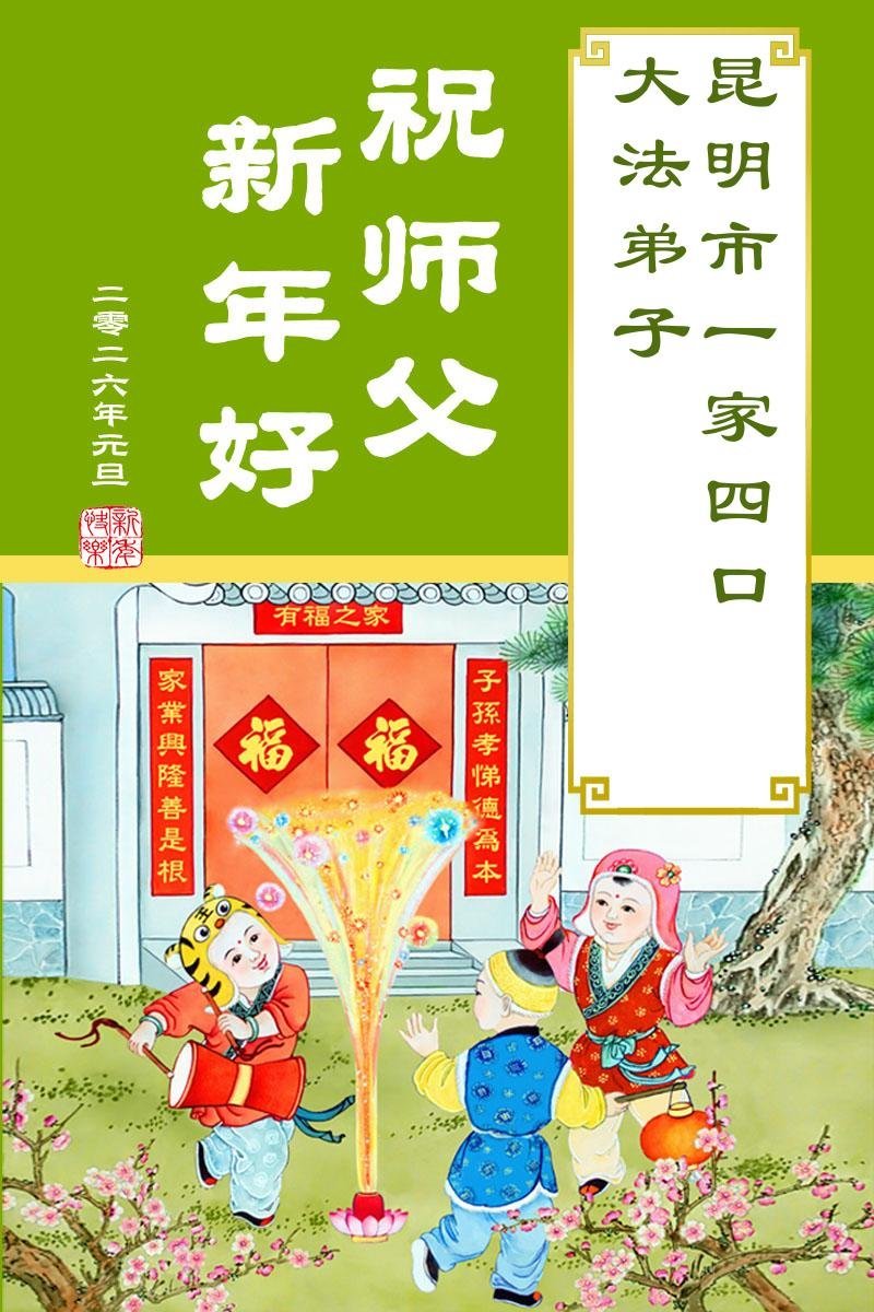 یک خانواده چهار نفره از تمرینکنندگان، به همراه تمرینکنندهای جدید در شهر کونمینگ، با احترام سال نو را به استاد بزرگ خیرخواه تبریک میگویند!