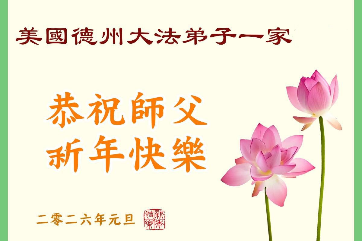 خانوادهای از تمرینکنندگان در تگزاس، ایالات متحده، با احترام سال نو را به استاد مهربان و بزرگوار تبریک میگویند!