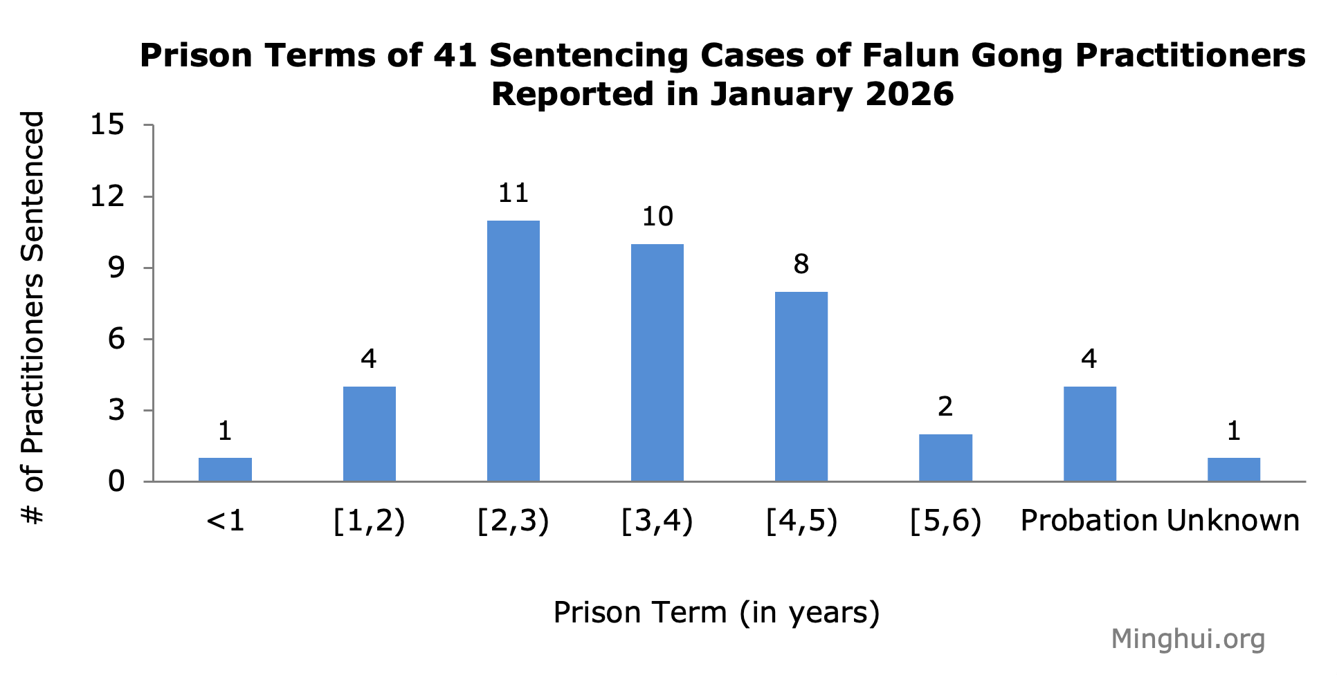 (Minghui.org) در ژانویه۲۰۲۶، درمجموع ۴۱ مورد صدورِ حکم زندان برای تمرینکنندگان فالون گونگ بهدلیل باورشان گزارش شد.