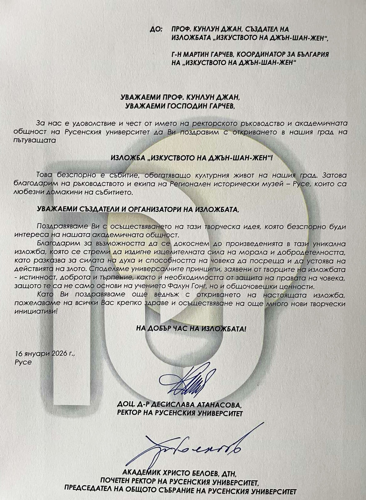 دانشیار پروفسور ایوانووا نماینده ویژۀ دانشیار پروفسور دسیسلاوا آتاناسوا (رئیس دانشگاه آنجل کانچف روسه) و نیز آکادمیسین هریستو بلویف (رئیس افتخاری دانشگاه و دارای مدرک دکترا) بود. او به نمایندگی از پروفسور آتاناسوا پیام تبریکی را به هماهنگکننده نمایشگاه «هنر جِن، شَن، رِن» ارائه کرد.