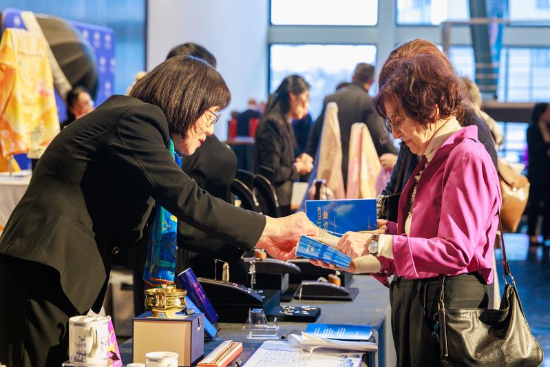 افرادی که در ۲۲ژانویه۲۰۲۶، در سیتی هال وین اجرای شن یون را دیدند، به کتابهای فالون دافا نگاه میکنند. (اپک تایمز)