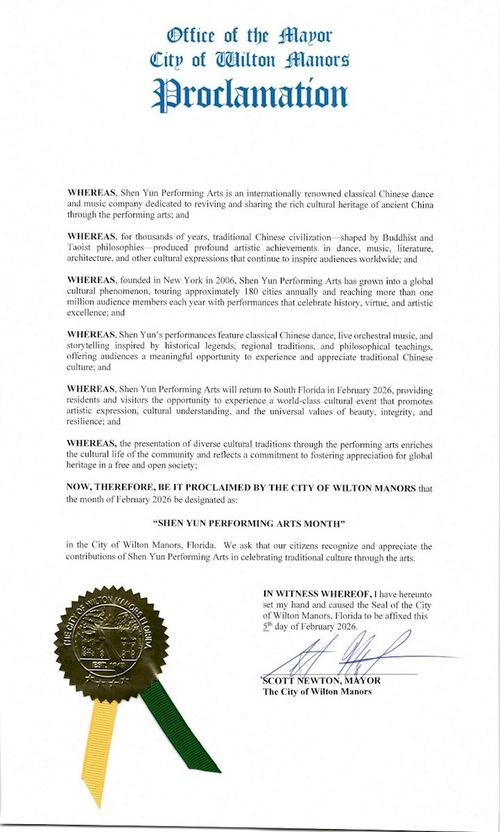 (Minghui.org) اسکات نیوتن، شهردار ویلتون مانورس در فلوریدا، بهمنظور خوشامدگویی به شن یون که قرار است در ۱۷ و ۱۸فوریه۲۰۲۶ اجرا داشته باشد، در ۵فوریه۲۰۲۶، با صدور بیانیهای رسمی ماه فوریه را در این شهر «ماه هنرهای نمایشی شن یون» نامگذاری کرد.