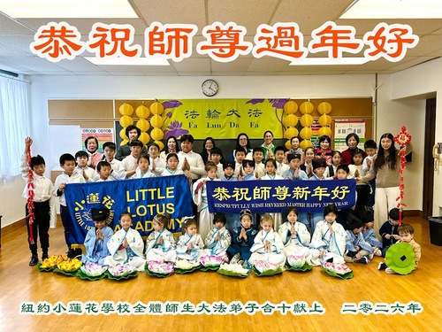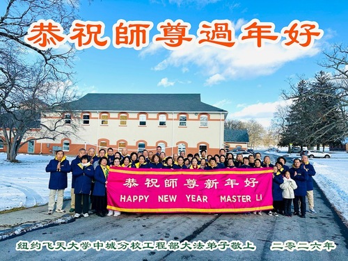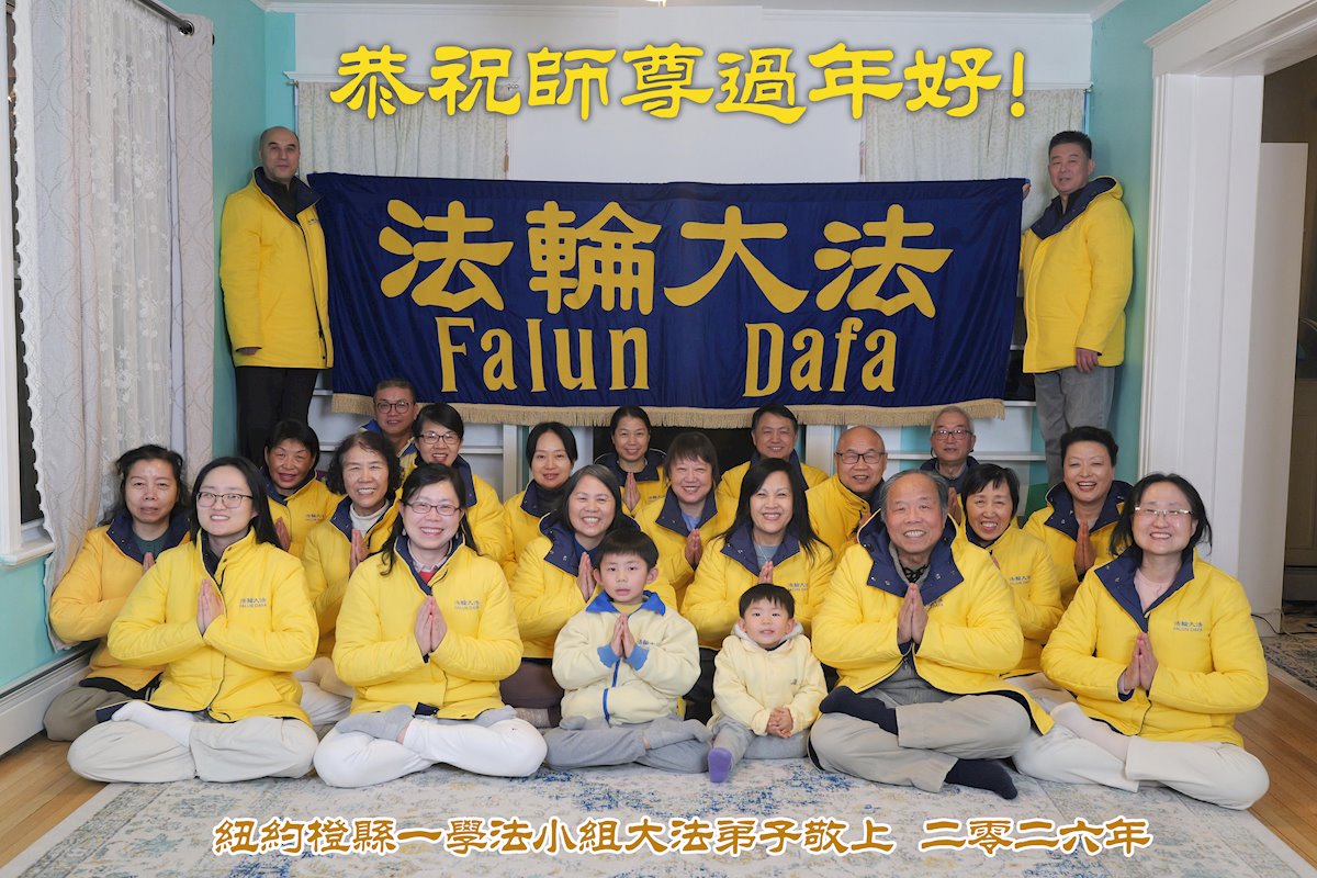 تبریک سال نو به استاد از سوی تمرینکنندگان یک مکان مطالعه فا در فلاشینگ، نیویورک