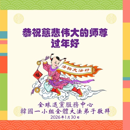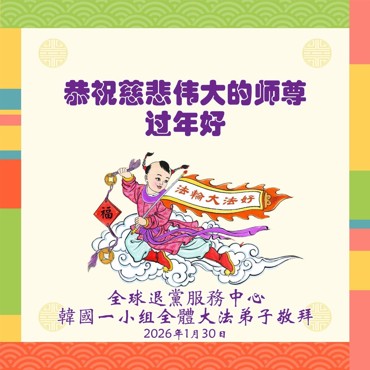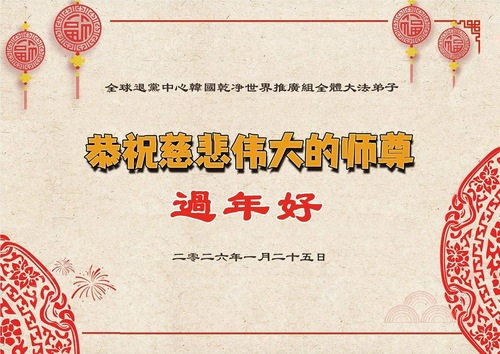 (Minghui.org) برای جشن سال نو چینی ۲۰۲۶، تمرینکنندگان فالون دافا در کره جنوبی تبریکات سال نو چینی خود را برای استاد لی ارسال کردند. همه آنها قدردانی عمیق خود را از استاد ابراز کردند.