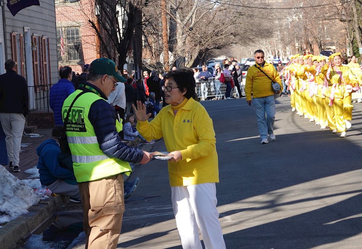 وانگ چونرونگ که در دهه ۸۰ زندگیاش است، در طول مسیر راهپیمایی، میان تماشاگران بروشور توزیع میکرد. او گفت این کار برایش معنای ویژهای دارد: «در چین، بهدلیل توزیع مطالب اطلاعرسانی توسط ح.ک.چ زندانی شدم و مورد آزار و شکنجه قرار گرفتم.»