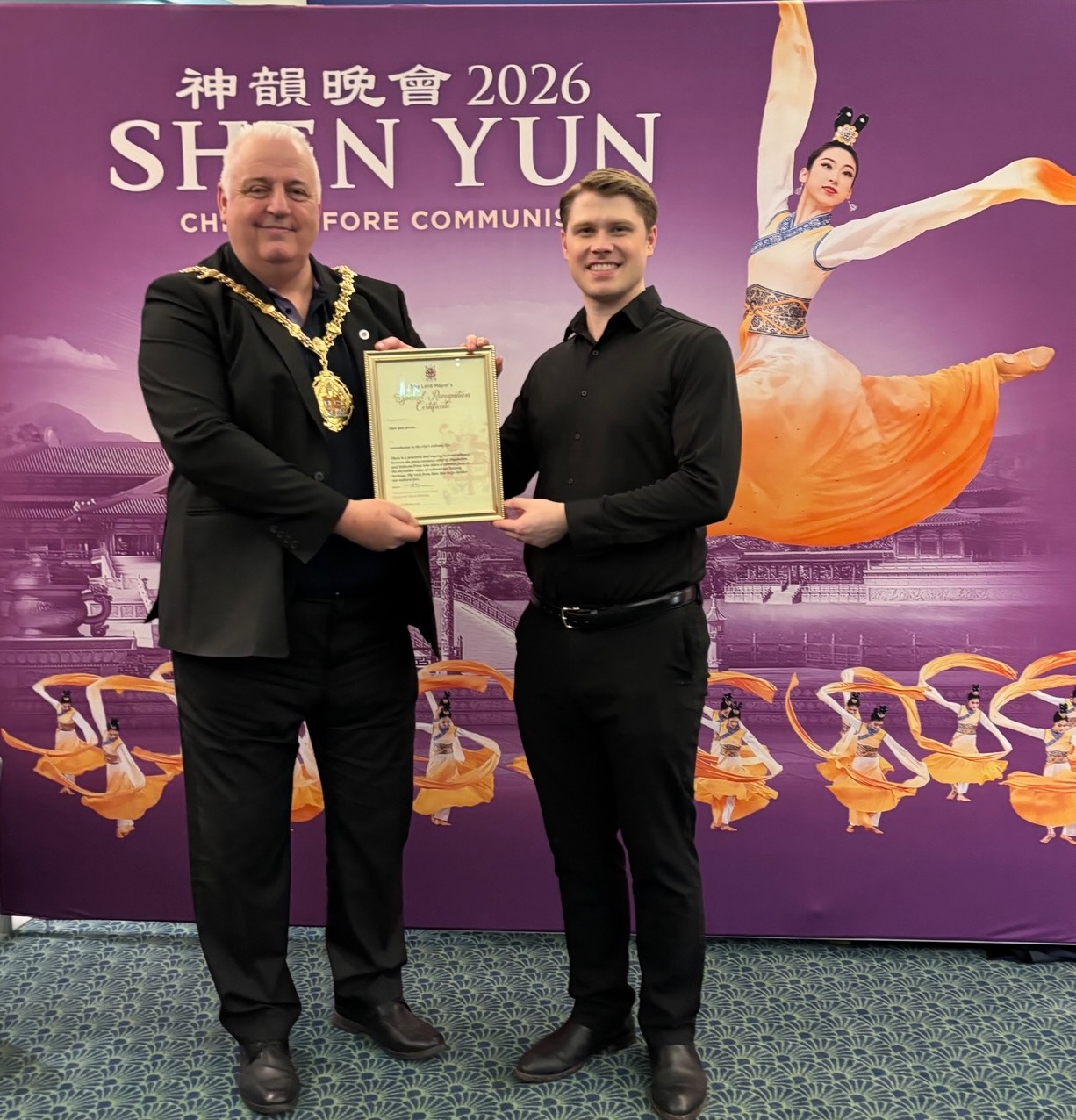 استیو واتکینز (چپ)، شهردار ارشد استوک-آن-ترنت، در پایان اجرای ۱۸فوریه۲۰۲۶، تقدیرنامه ویژه شهردار ارشد را به شن یون اهدا کرد.